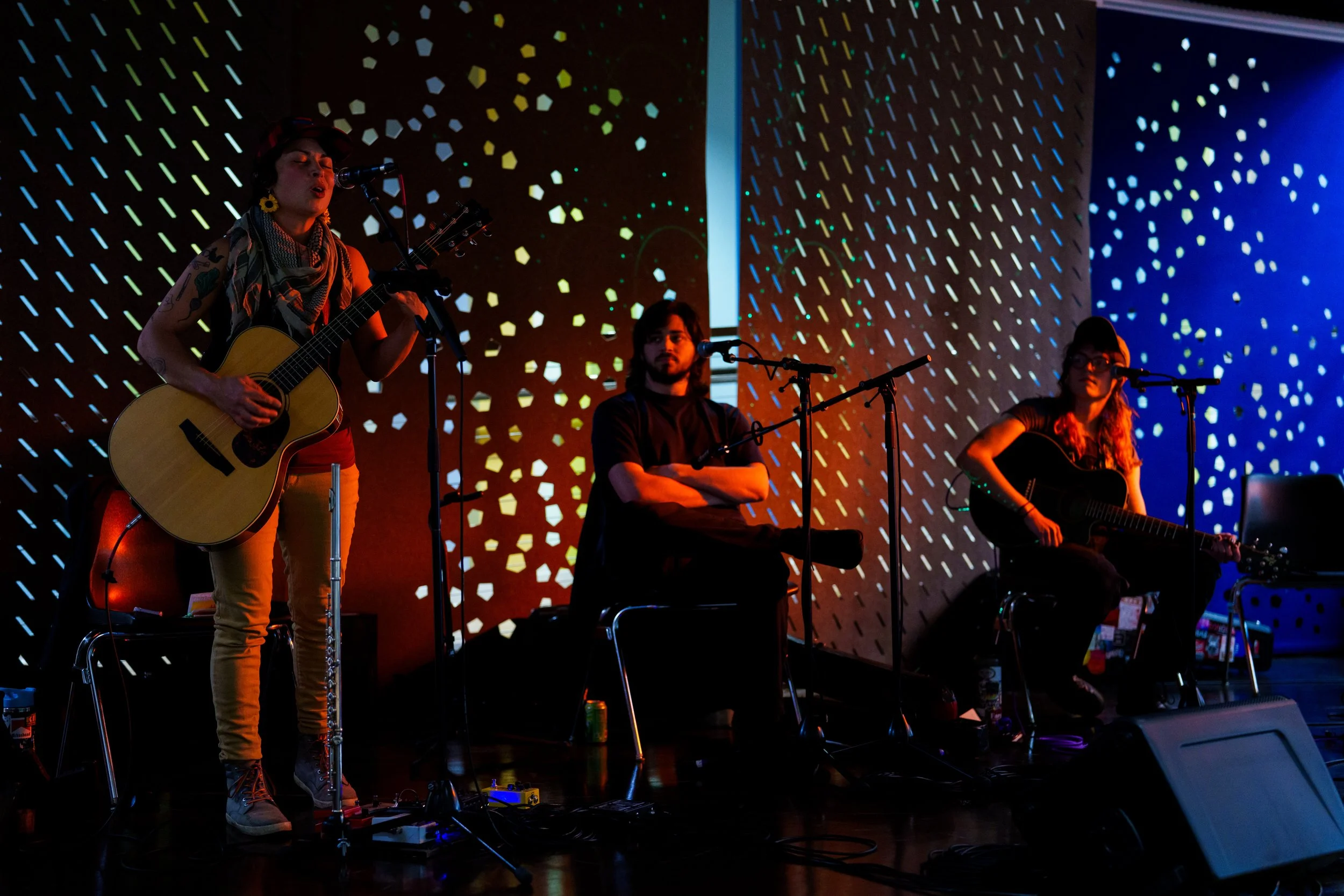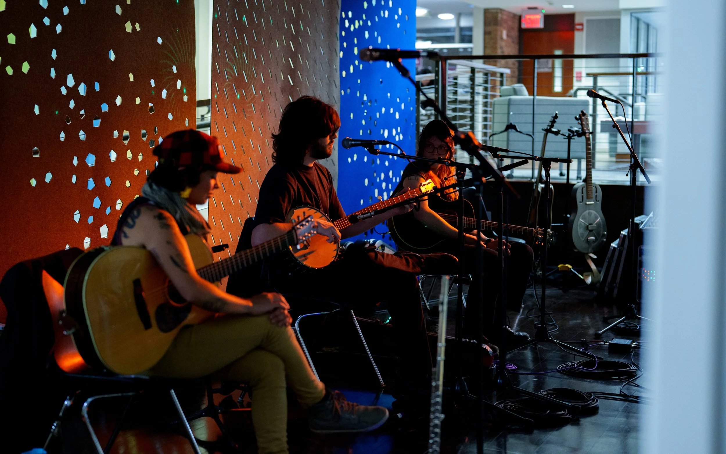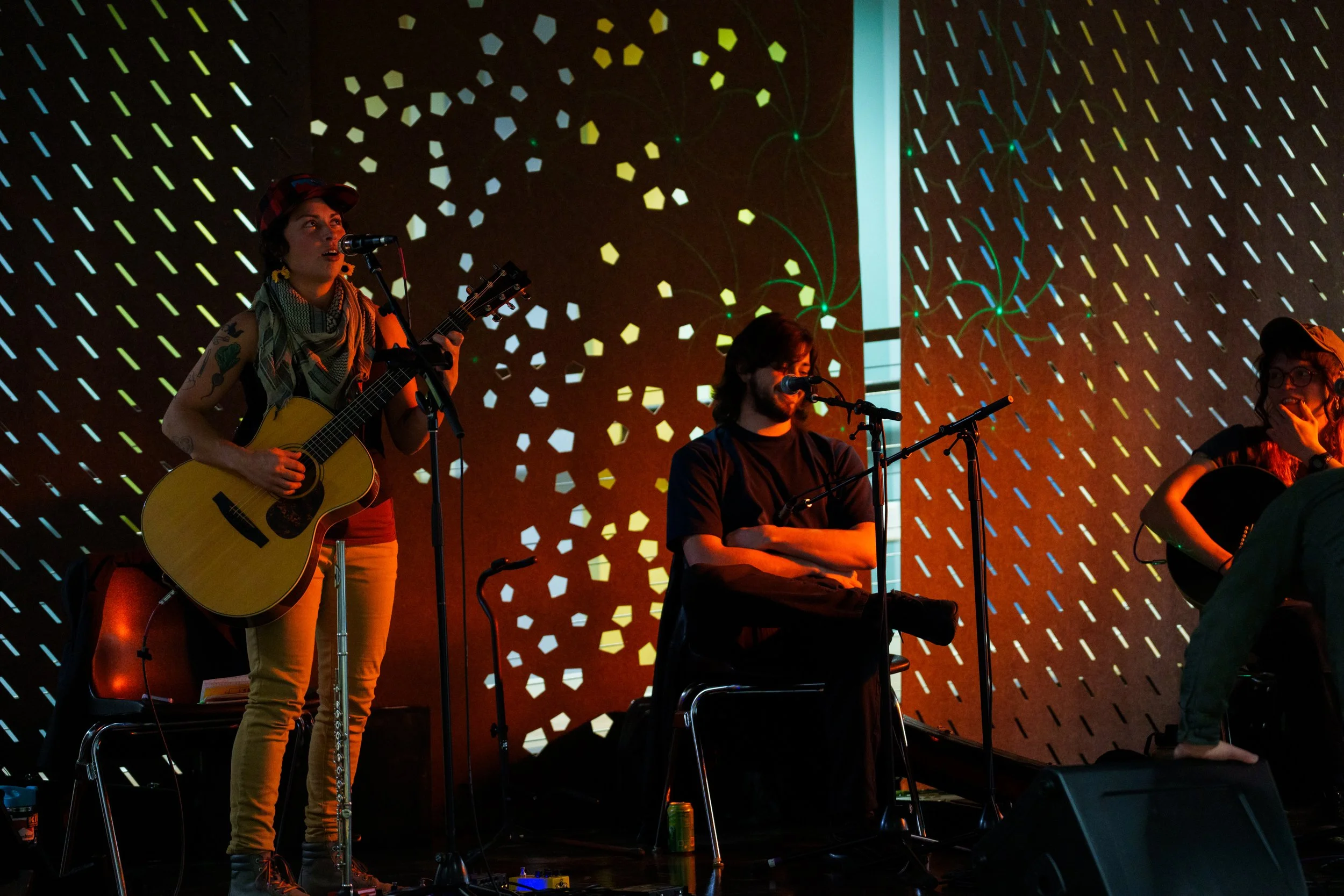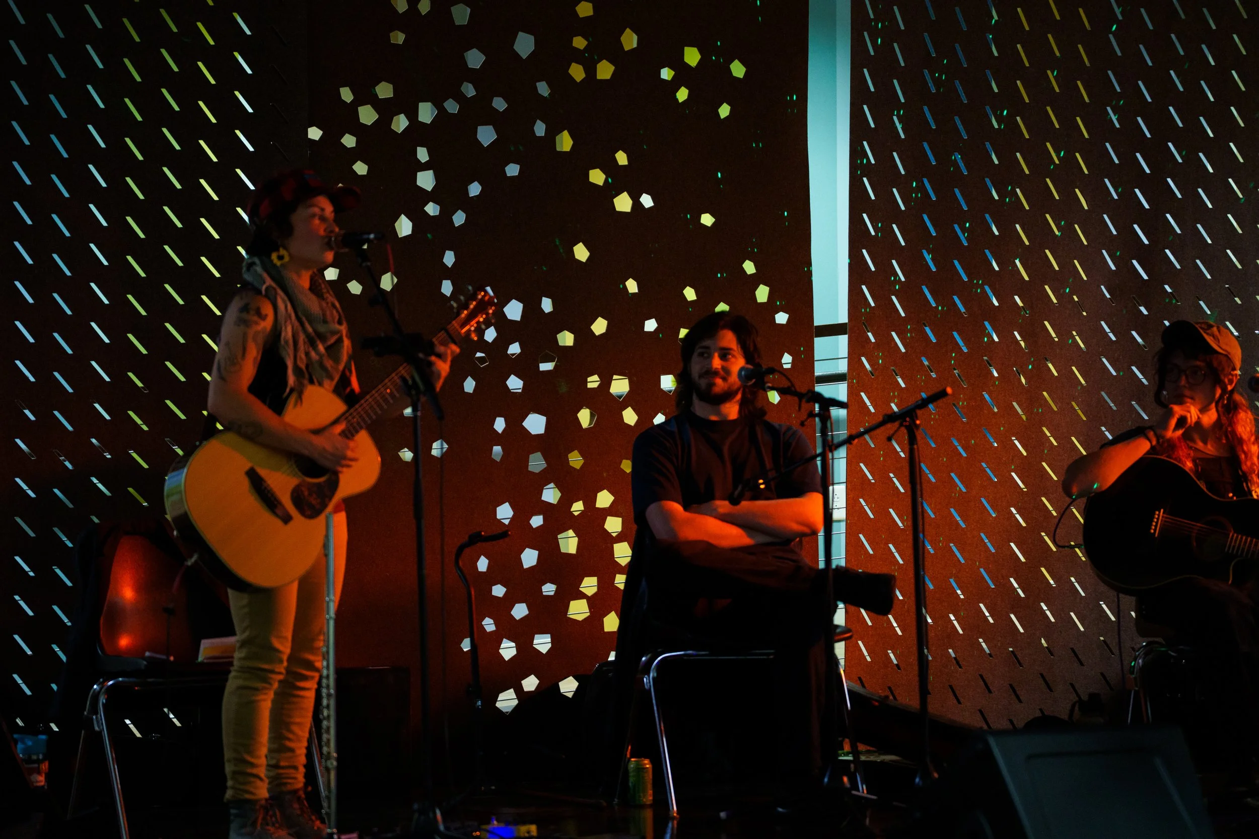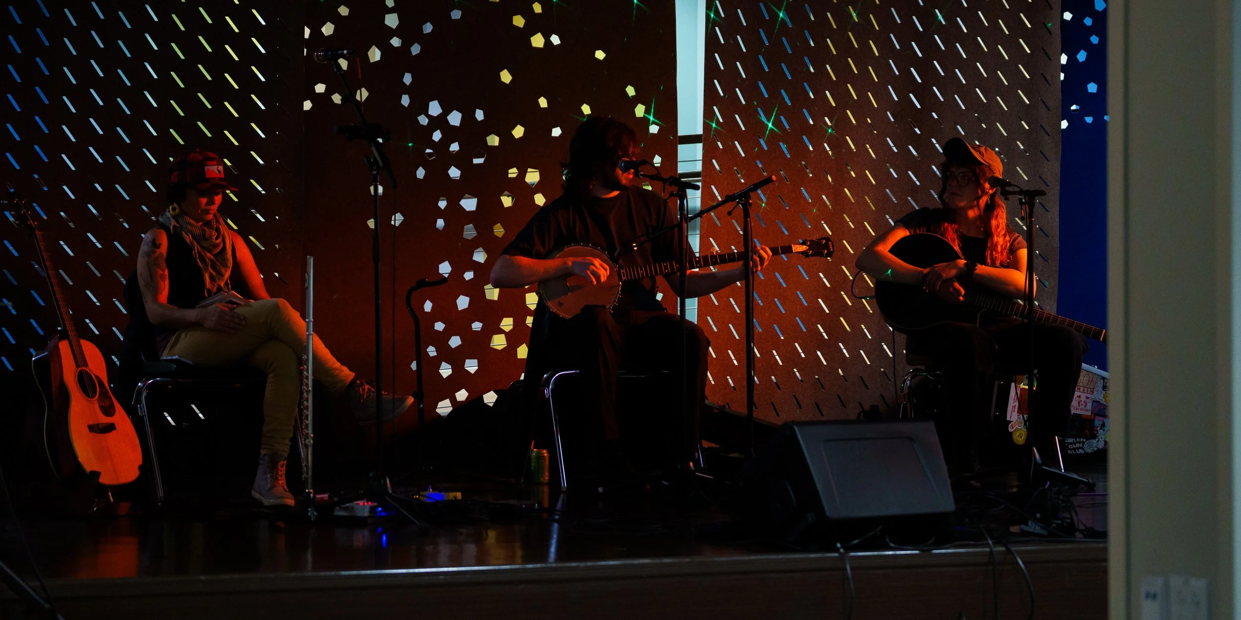 A songwriters' round sponsored by the Earlham Collage Music Department, hosted November of 2025 featuring Anna p.s. , Elijah Baston, and Cyrus Garretson.