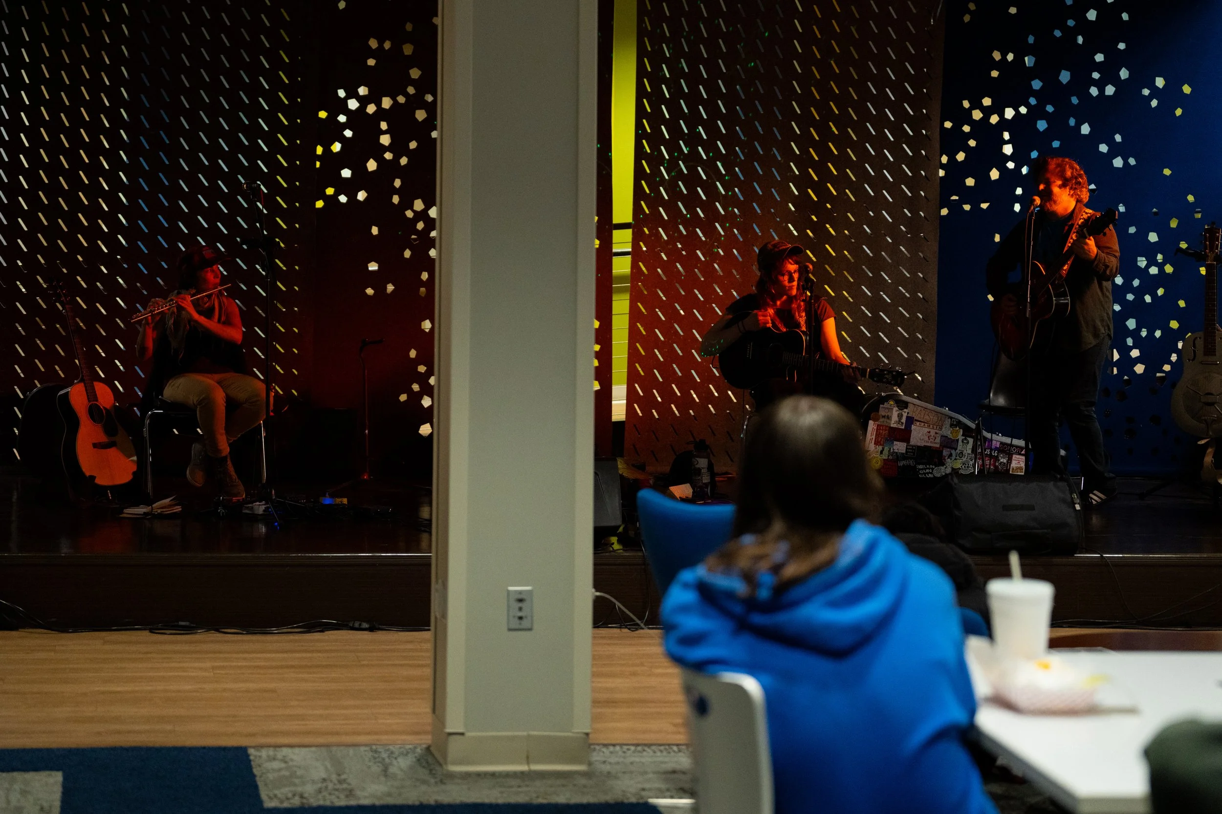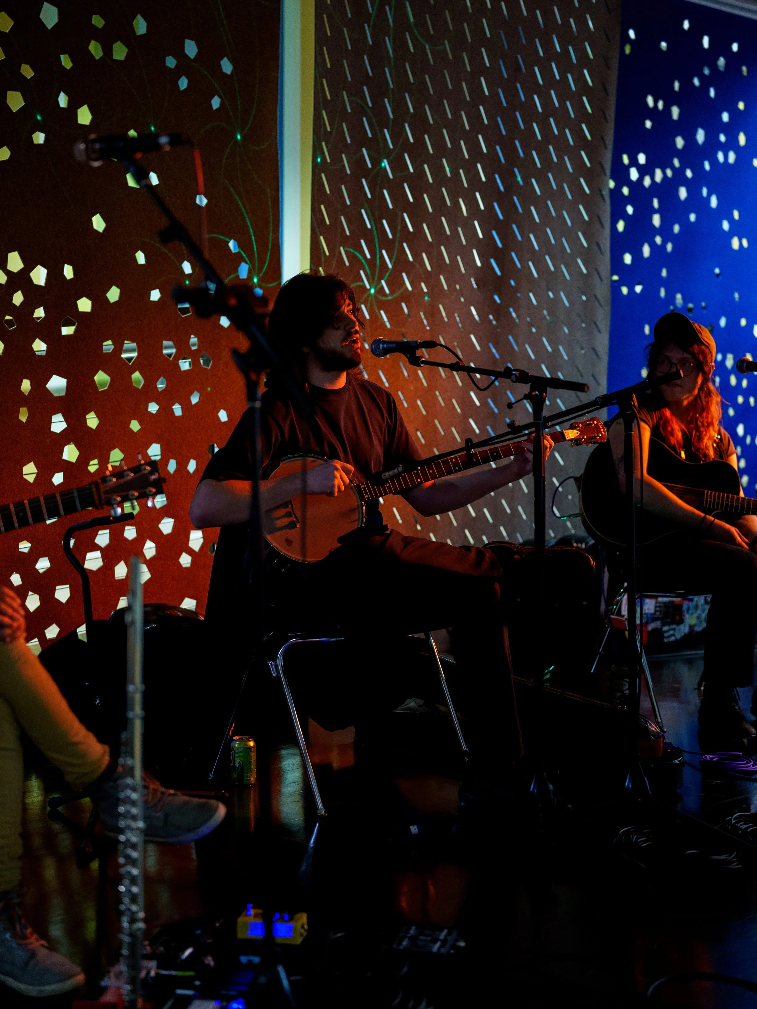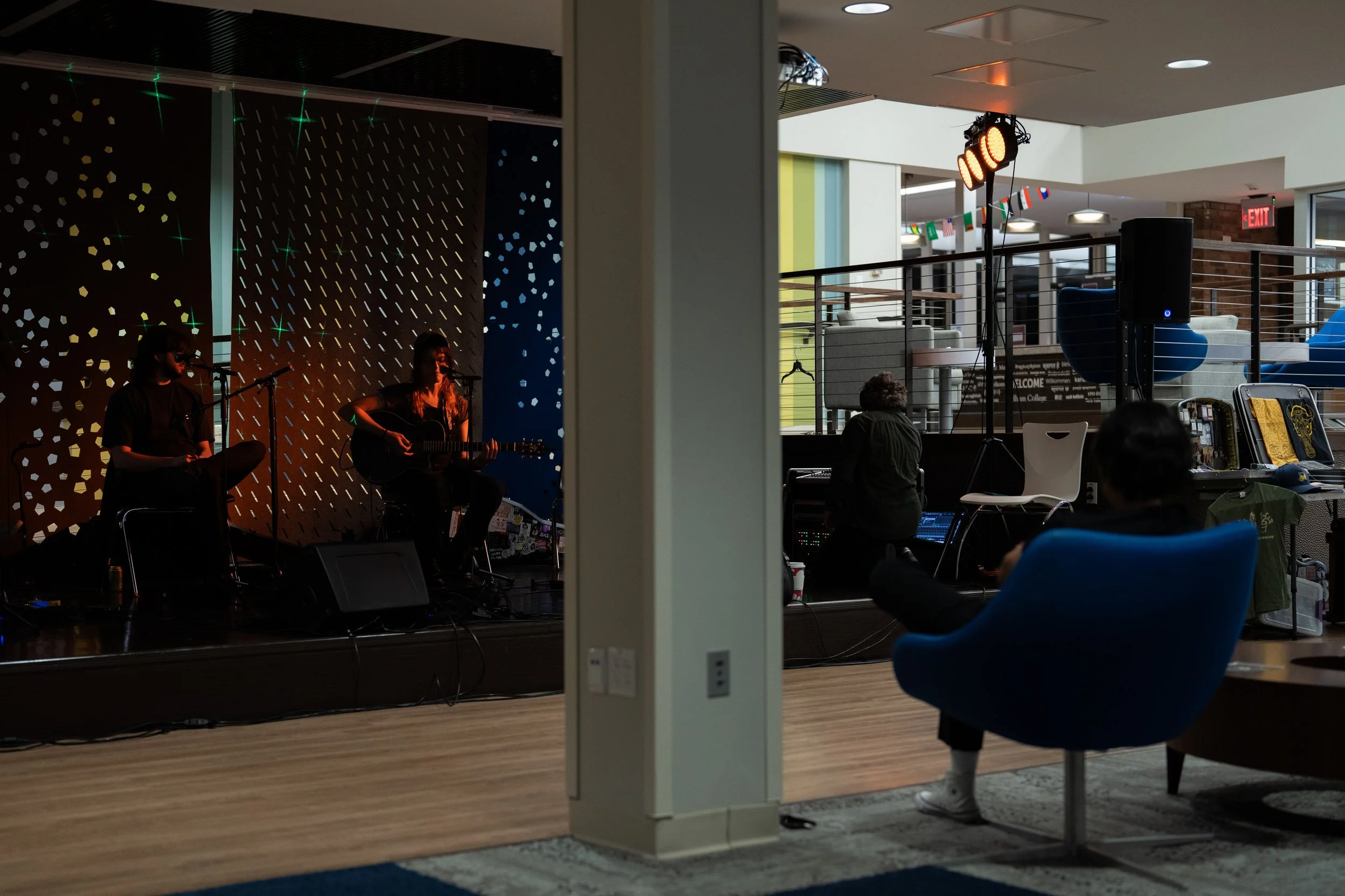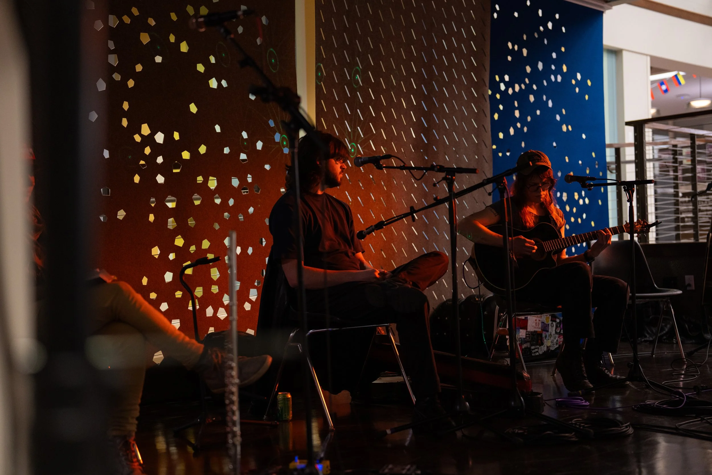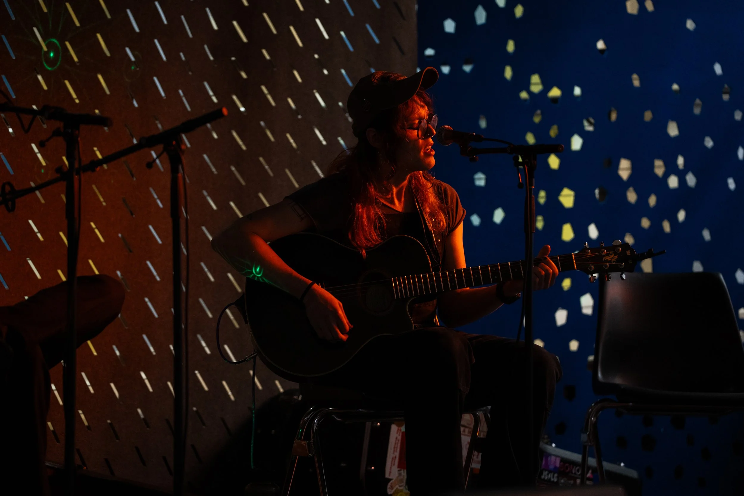 A songwriters' round sponsored by the Earlham Collage Music Department, hosted November of 2025 featuring Anna p.s. , Elijah Baston, and Cyrus Garretson.