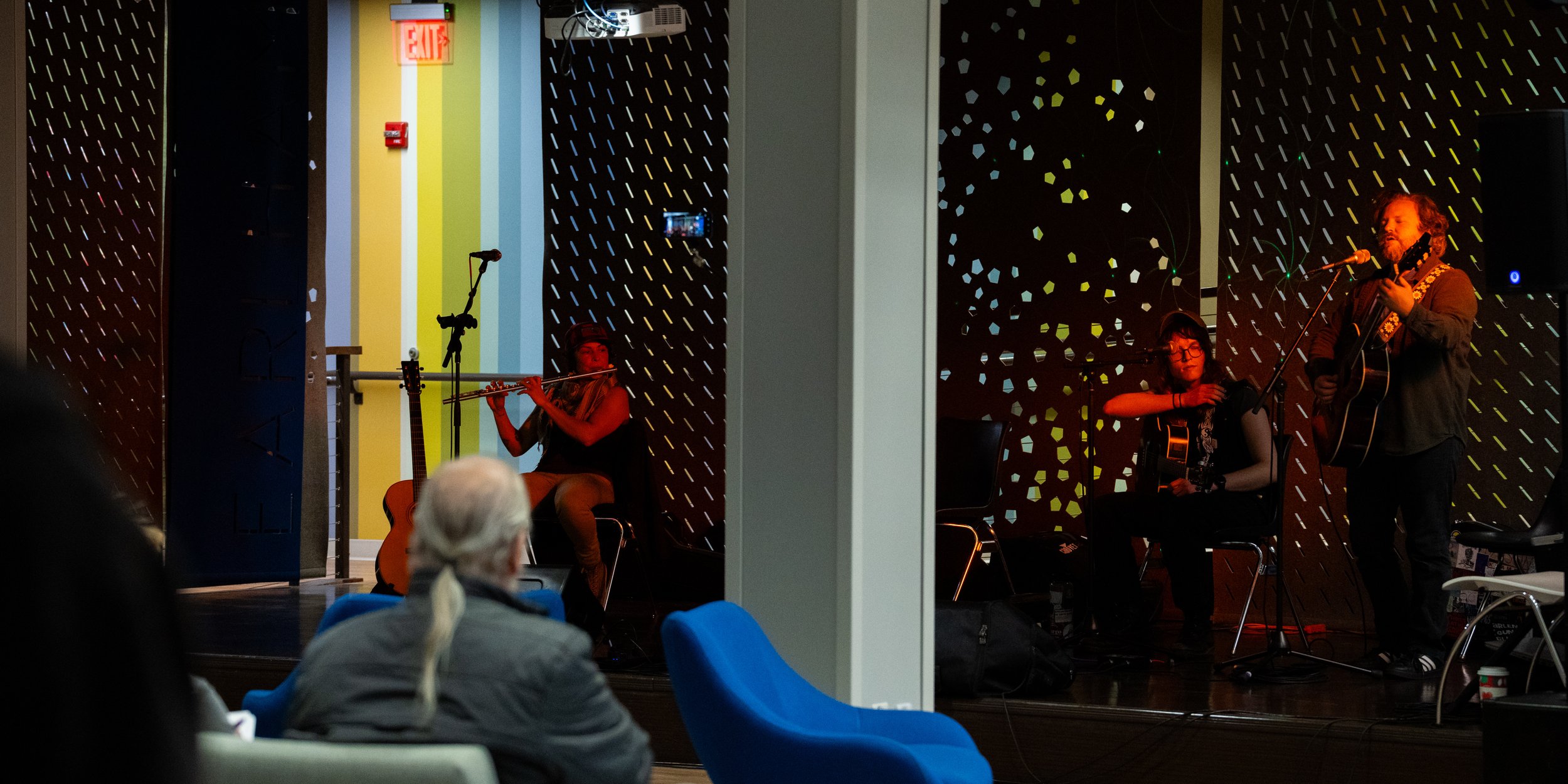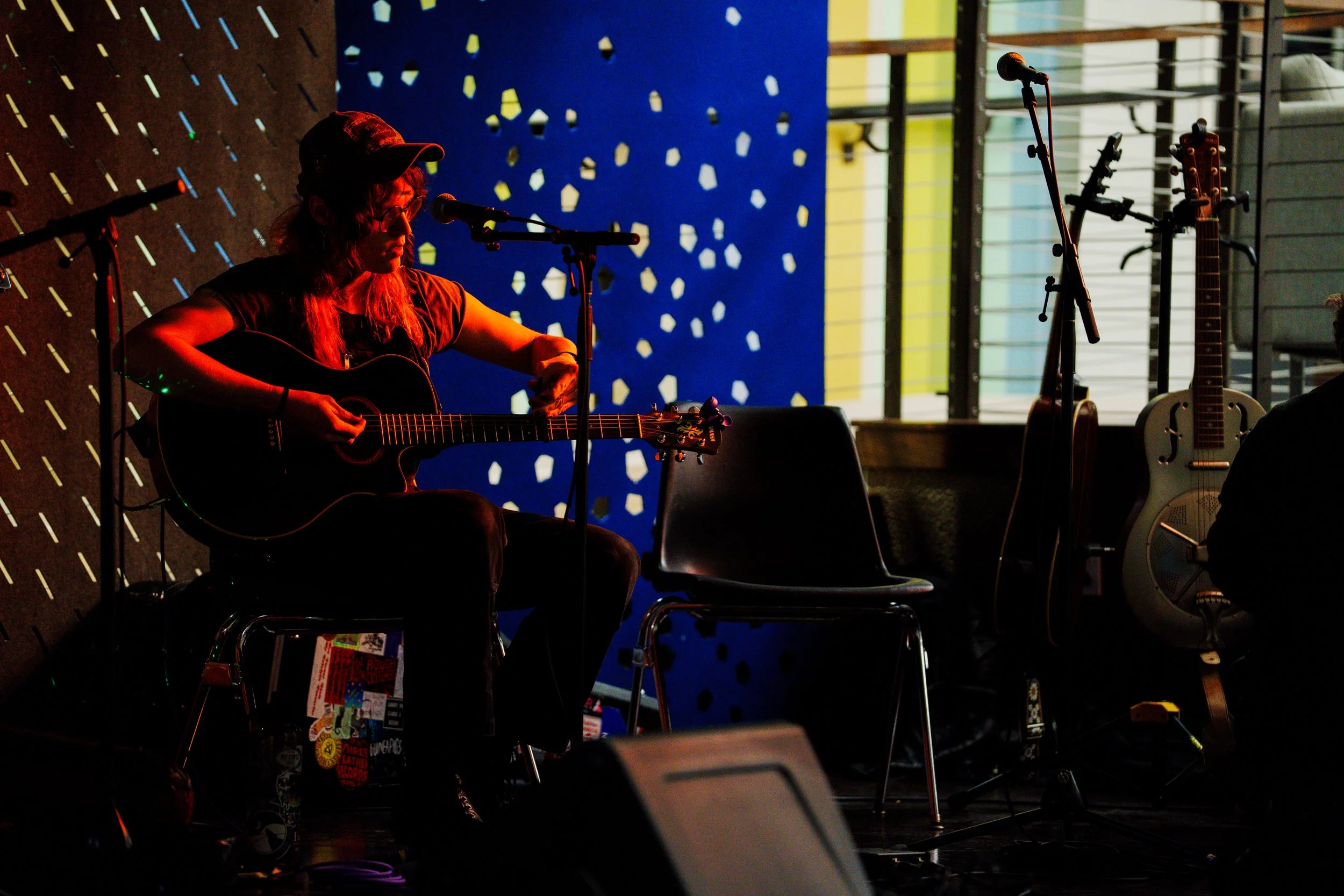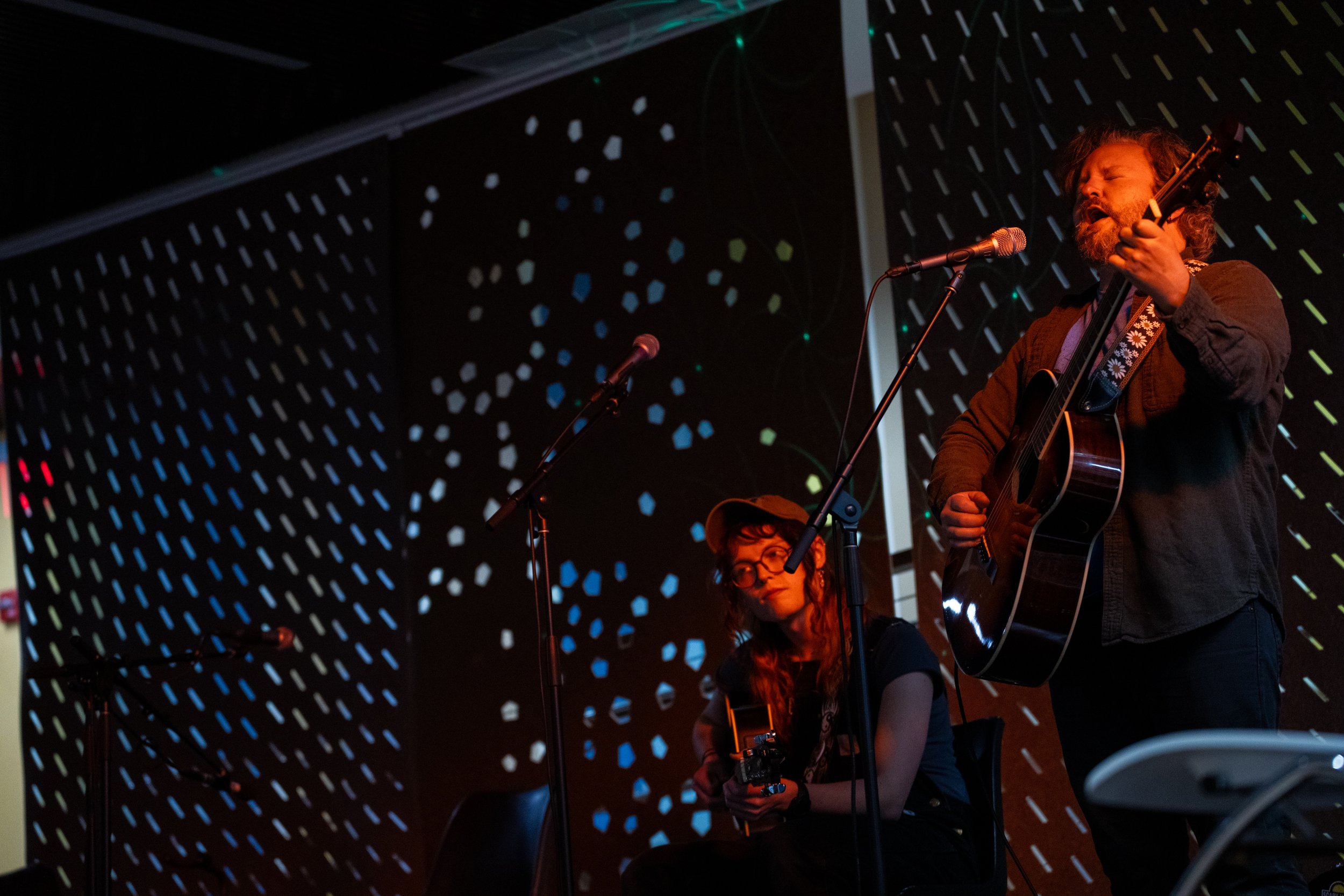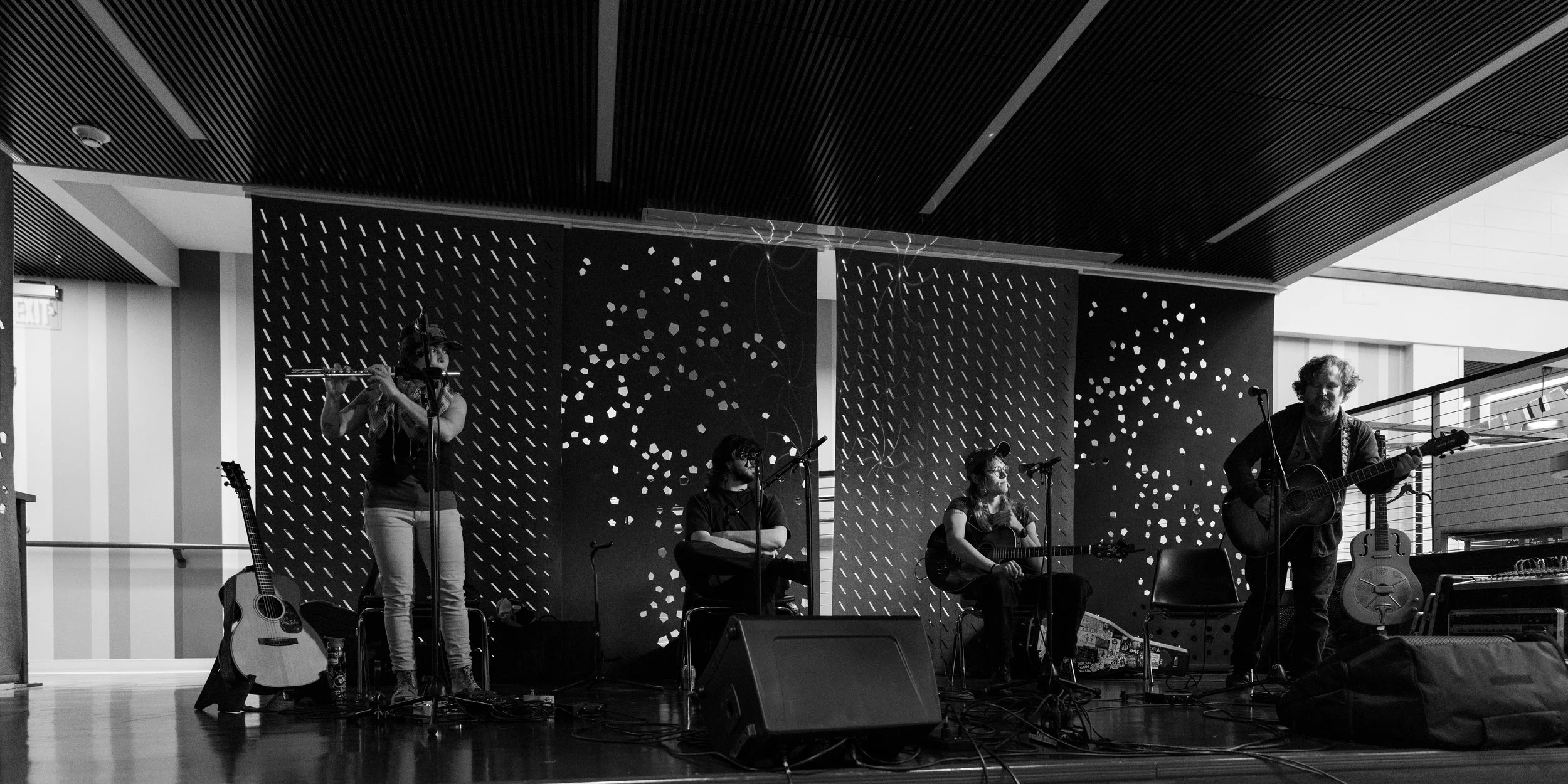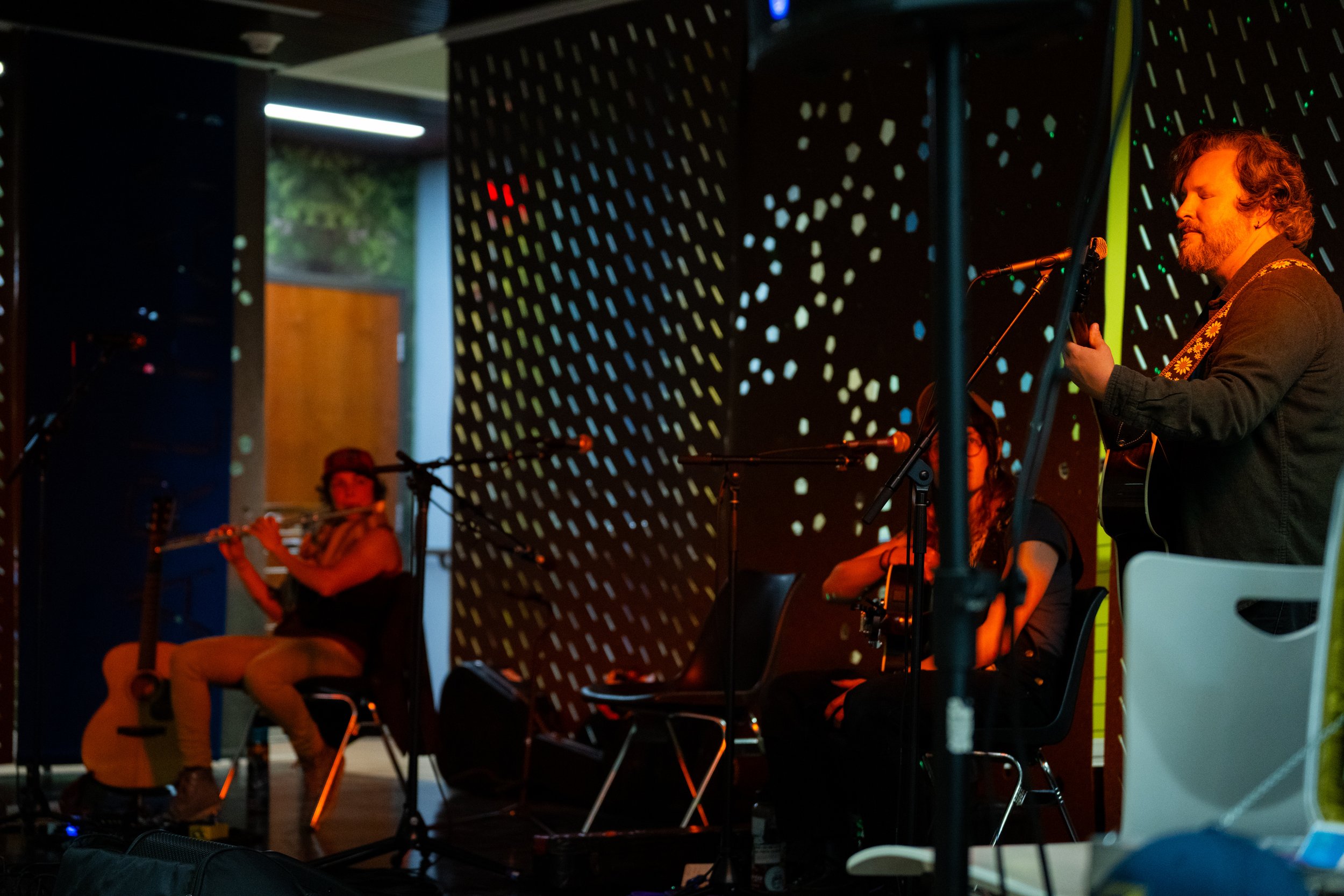 A songwriters' round sponsored by the Earlham Collage Music Department, hosted November of 2025 featuring Anna p.s. , Elijah Baston, and Cyrus Garretson.