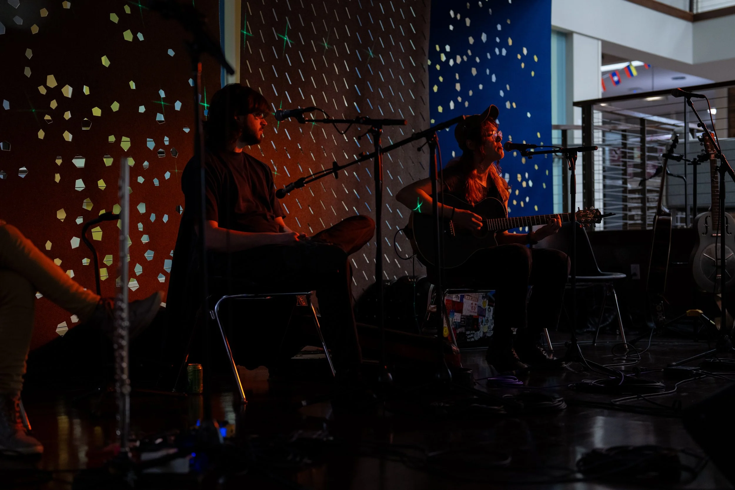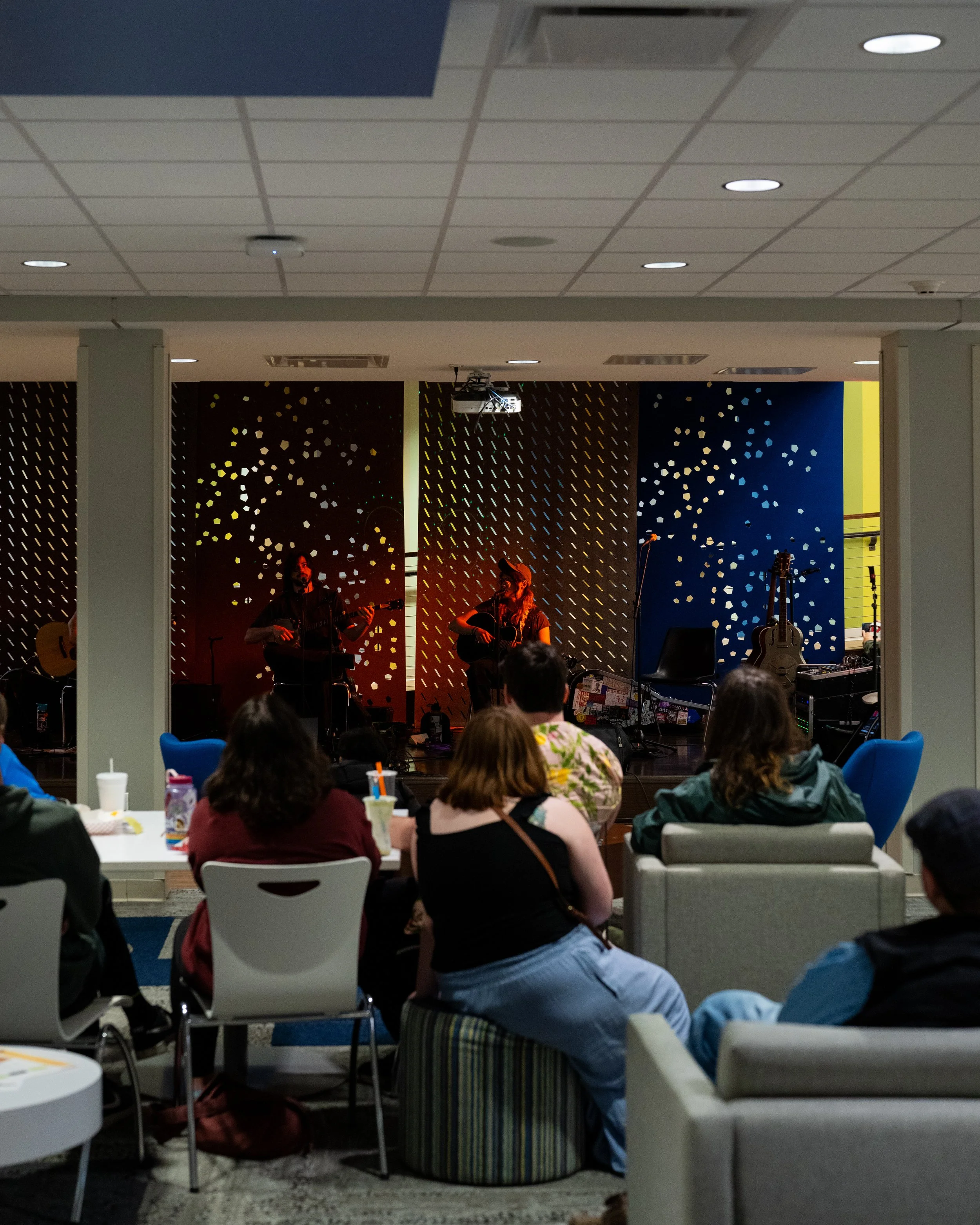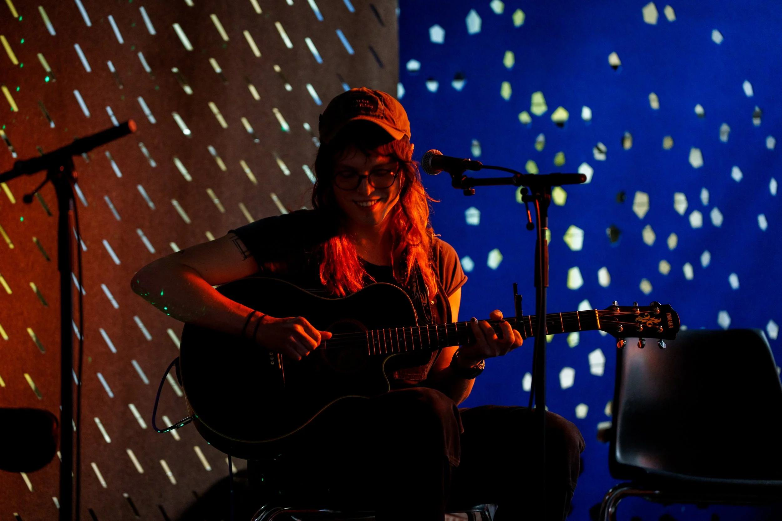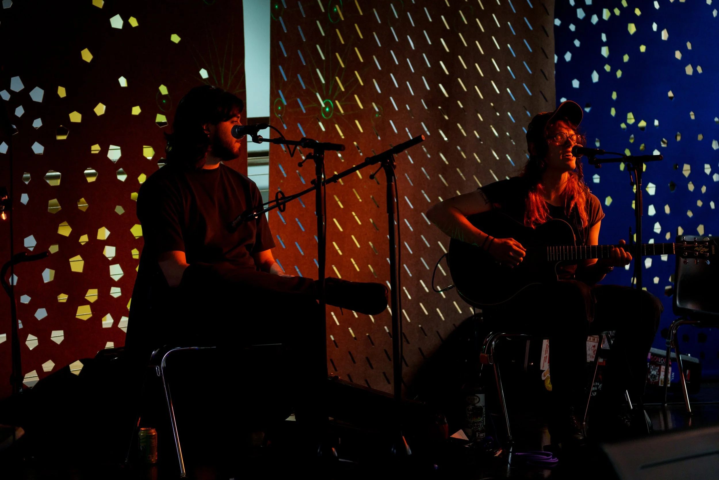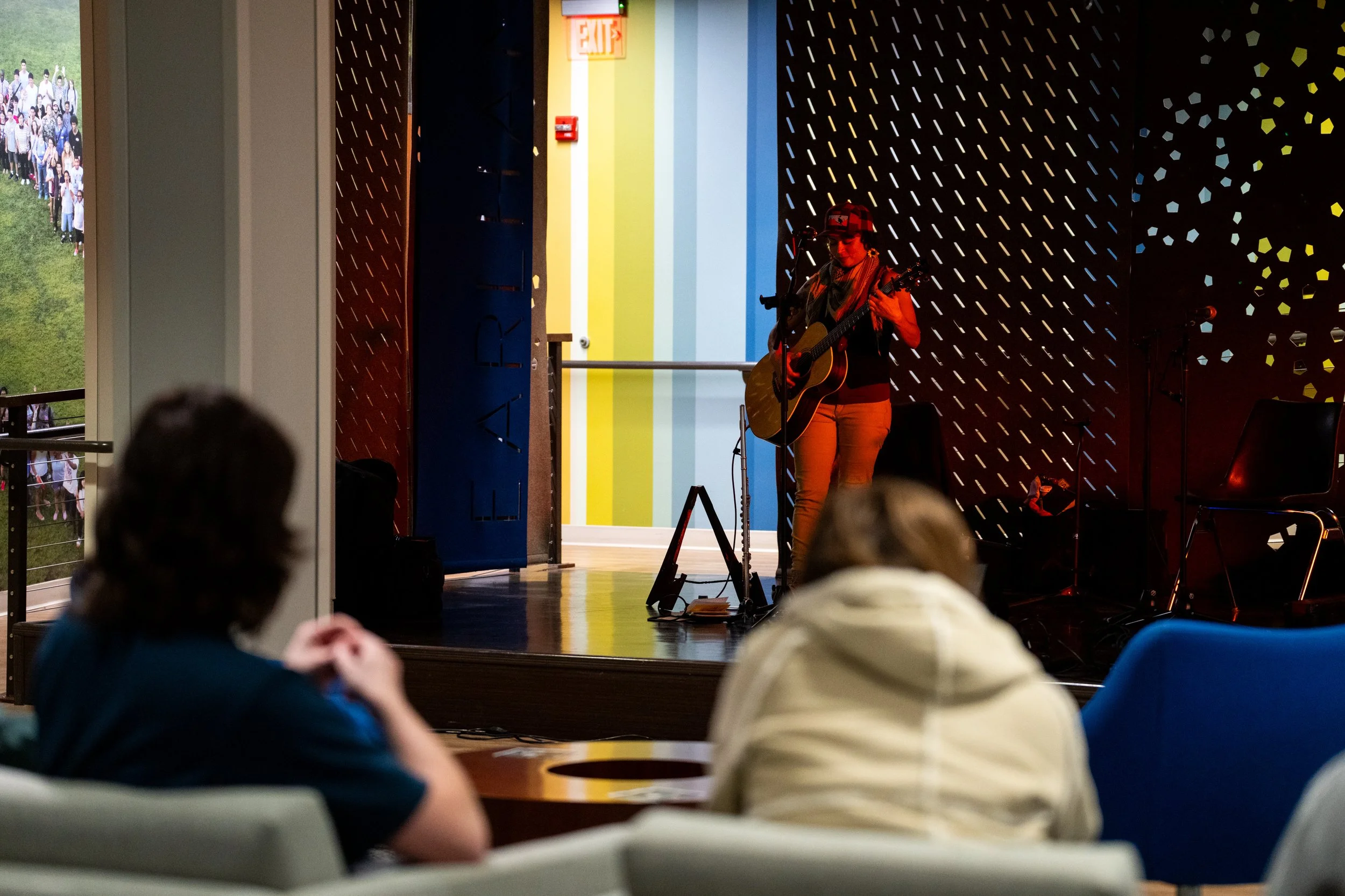 A songwriters' round sponsored by the Earlham Collage Music Department, hosted November of 2025 featuring Anna p.s. , Elijah Baston, and Cyrus Garretson.