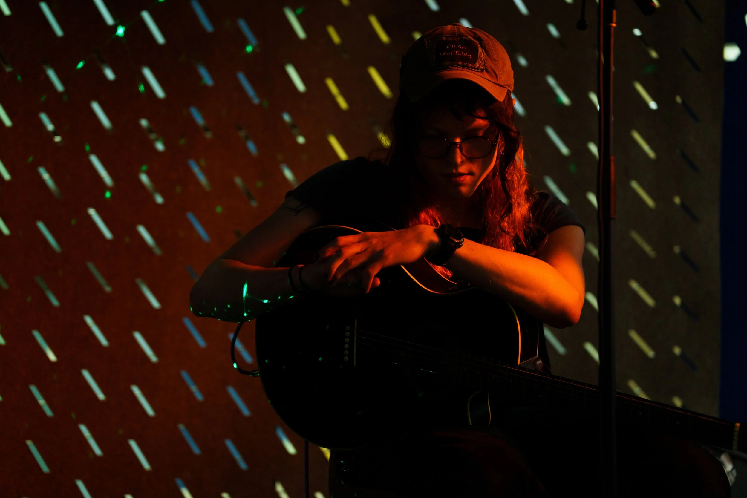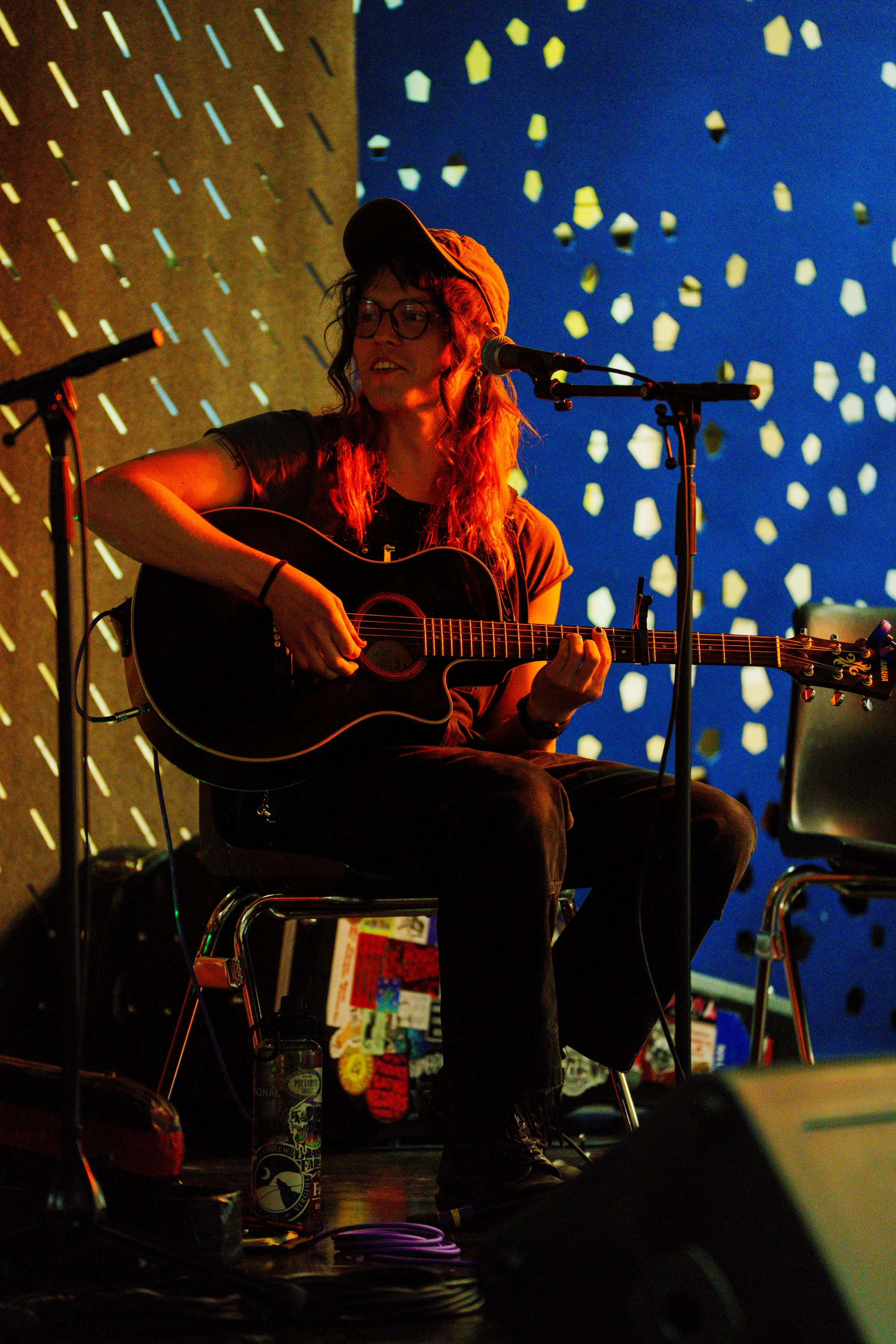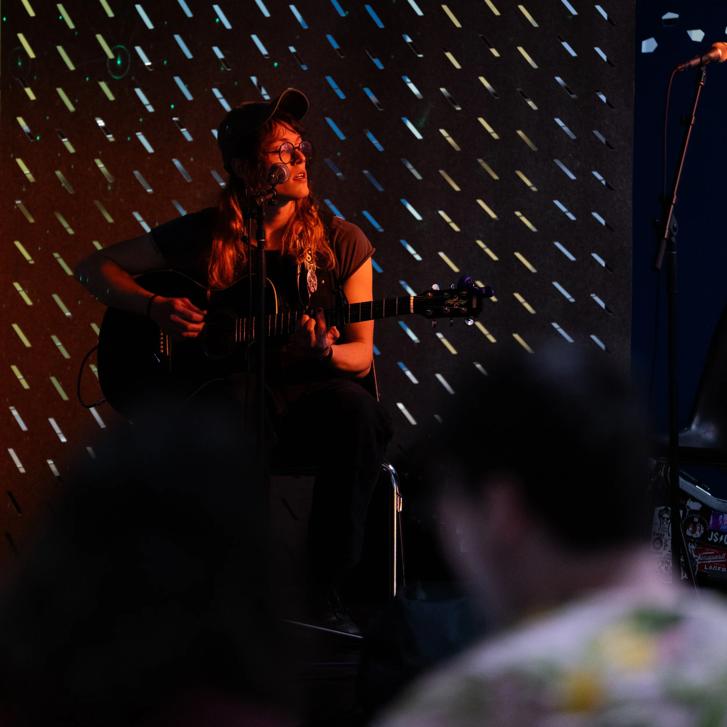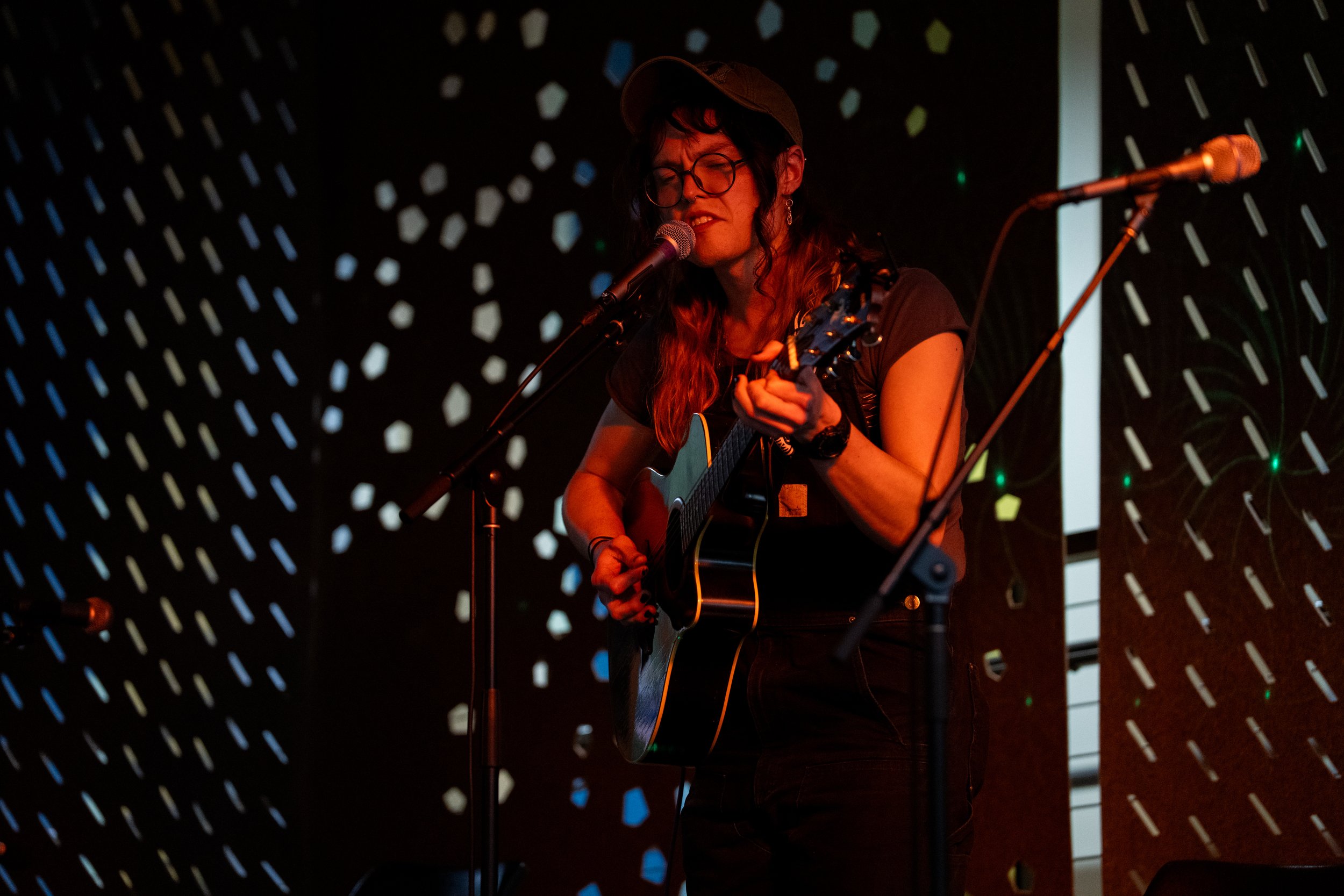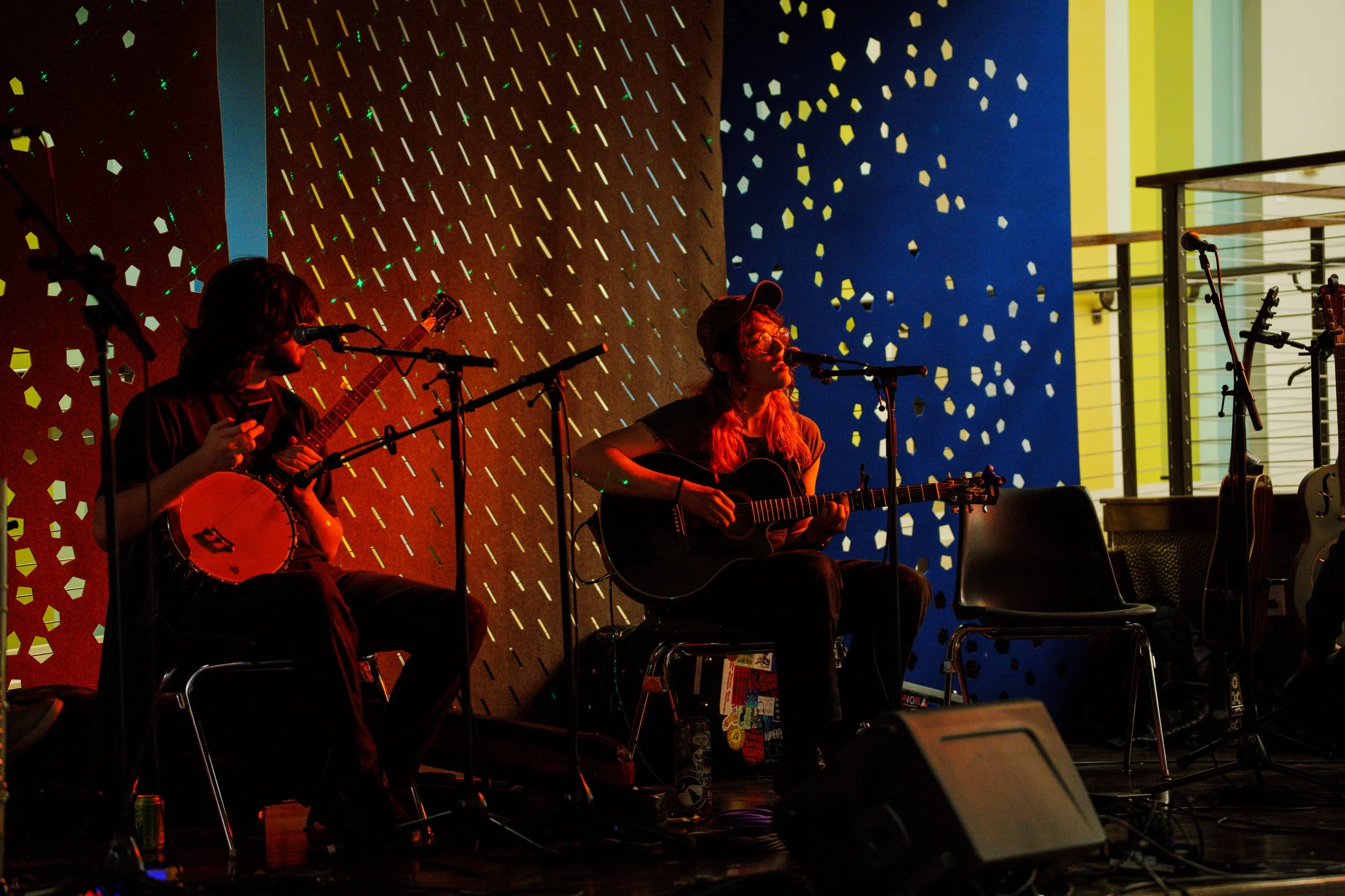 A songwriters' round sponsored by the Earlham Collage Music Department, hosted November of 2025 featuring Anna p.s. , Elijah Baston, and Cyrus Garretson.