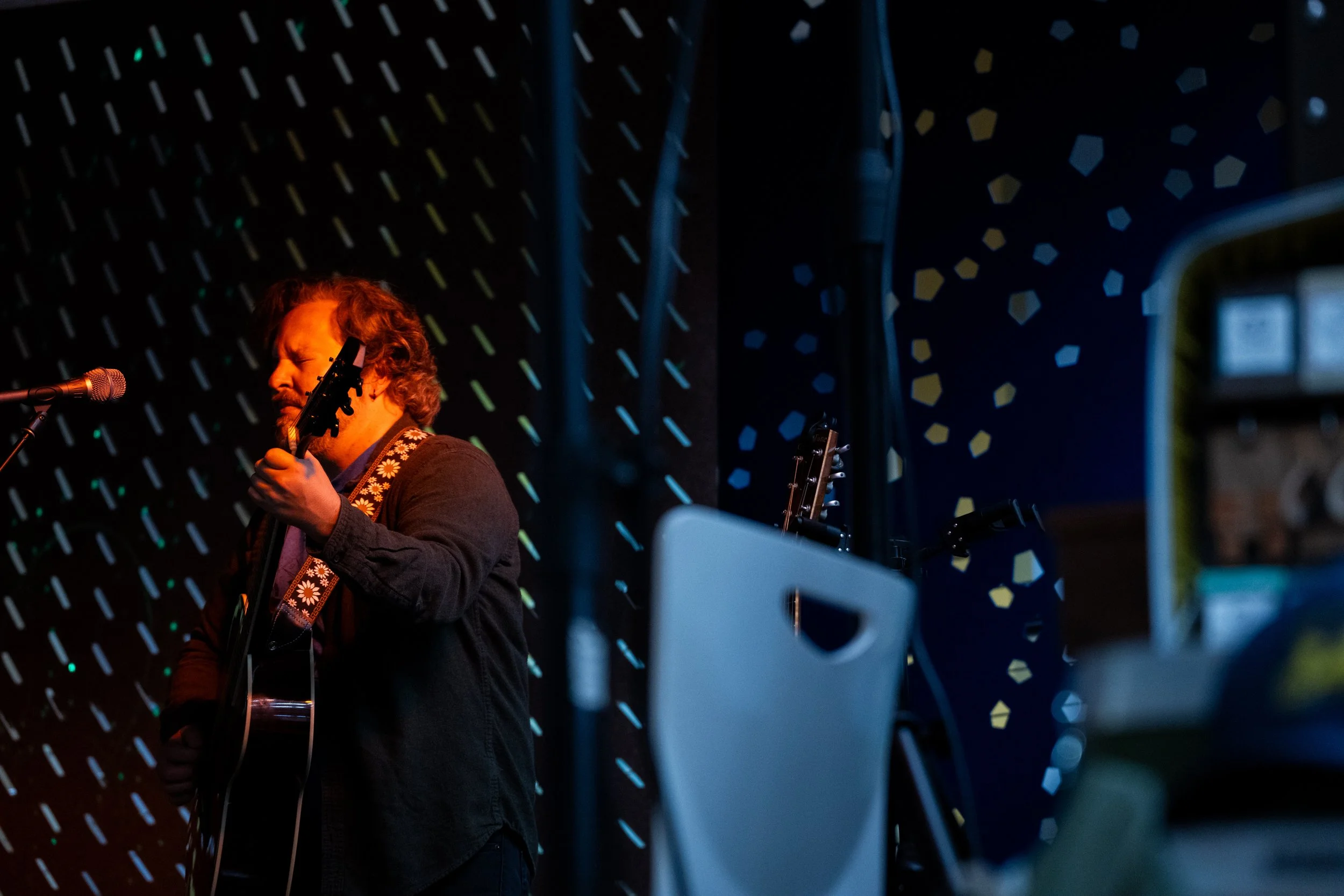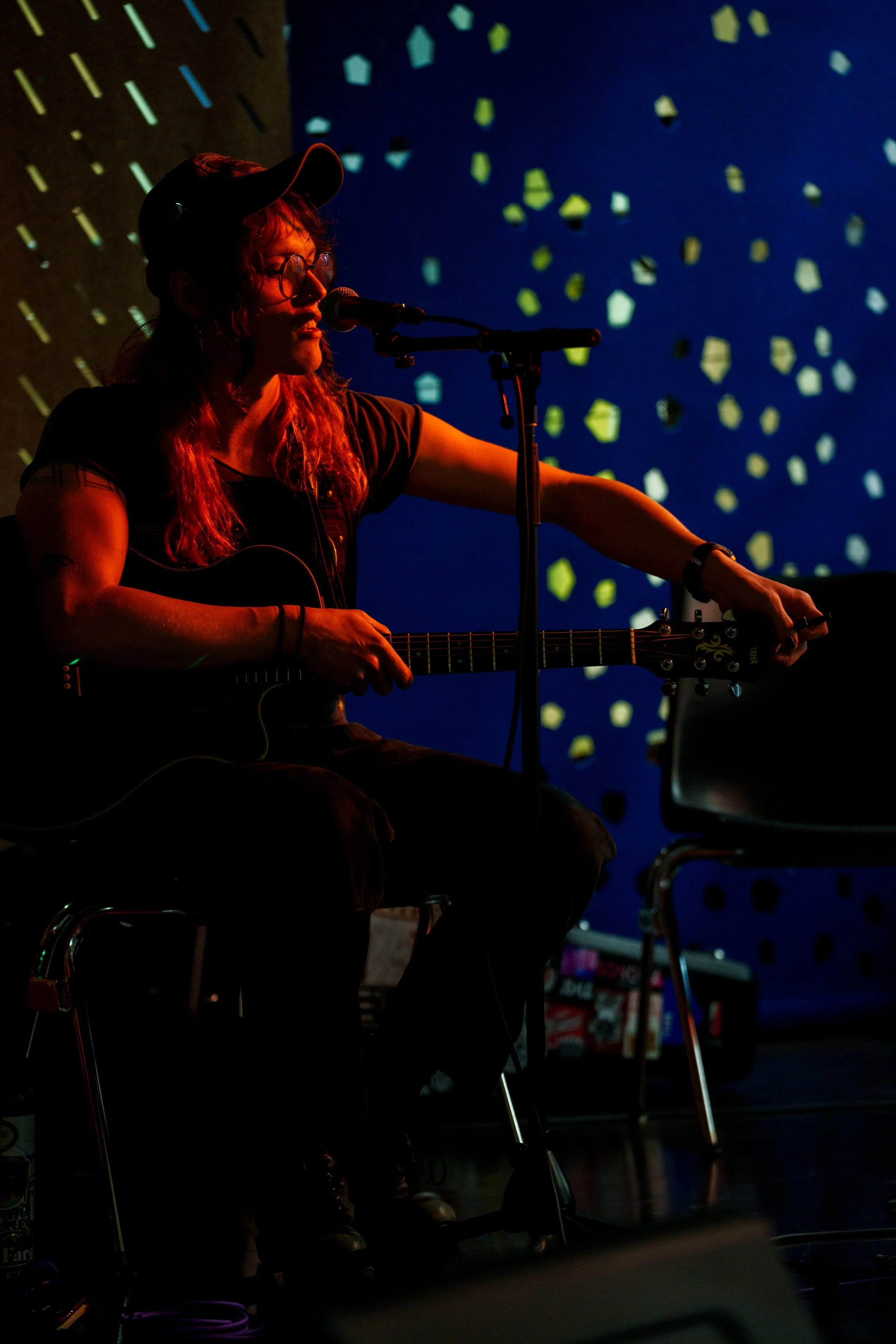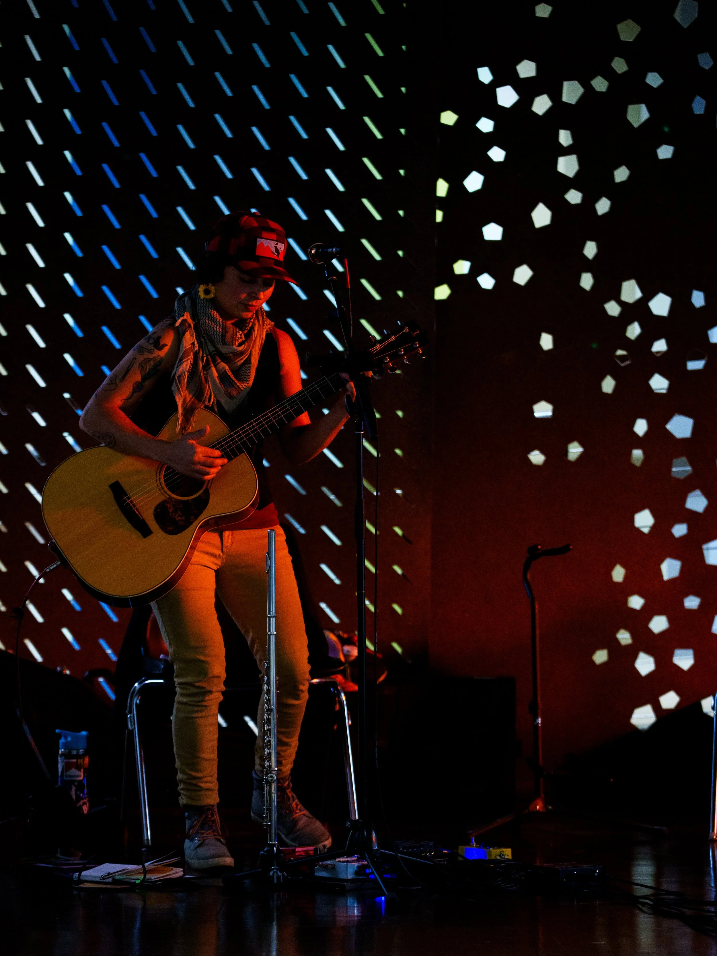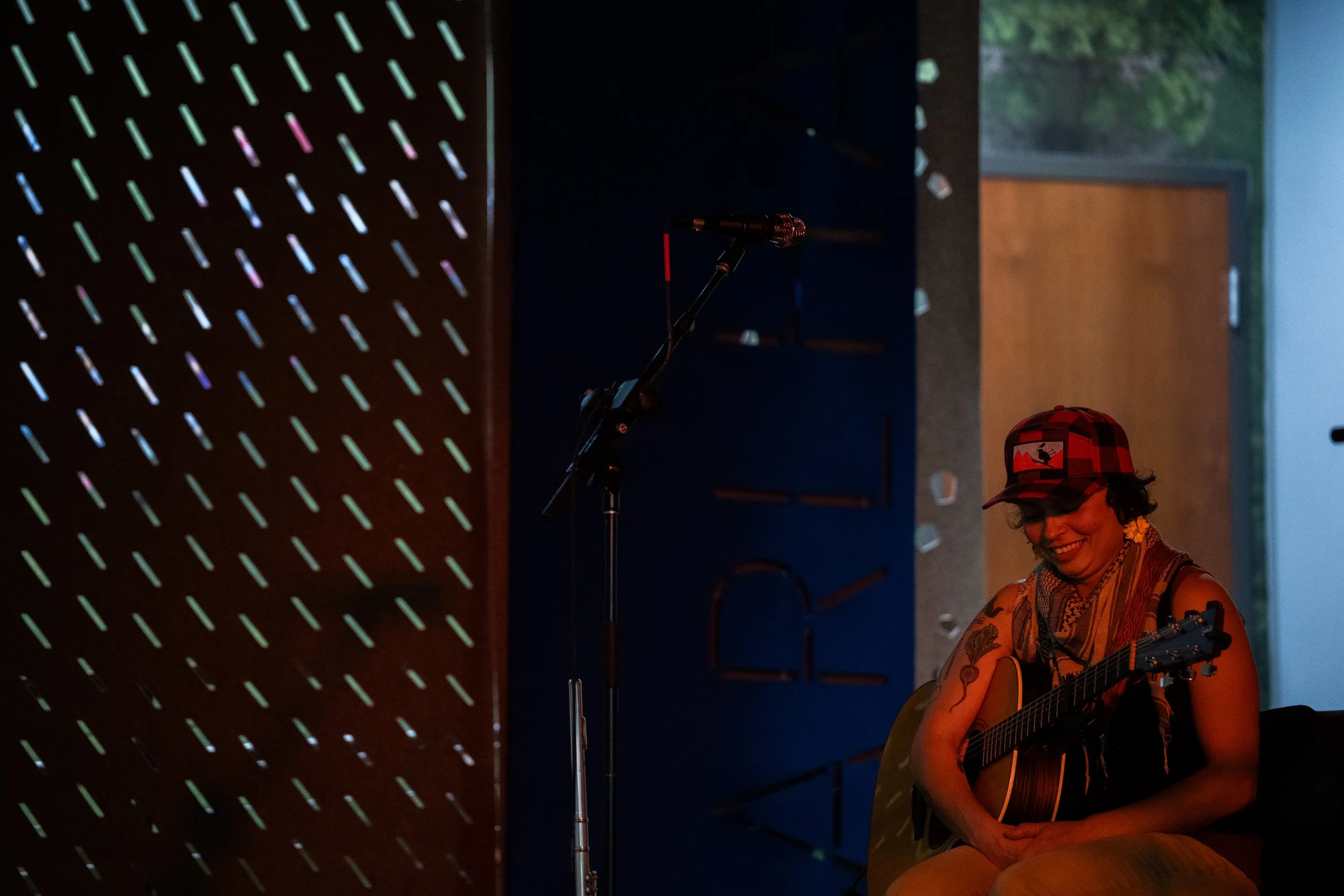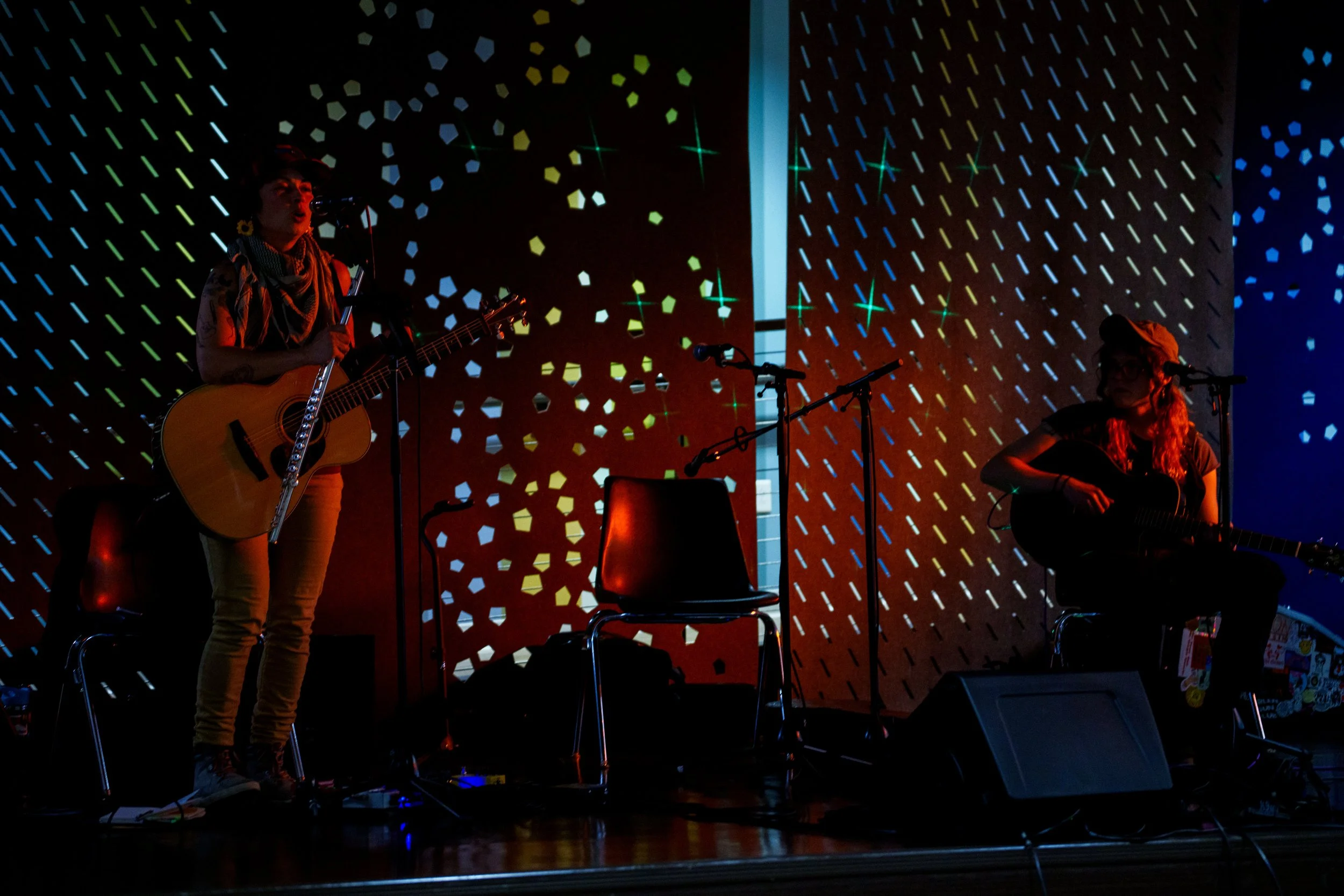 A songwriters' round sponsored by the Earlham Collage Music Department, hosted November of 2025 featuring Anna p.s. , Elijah Baston, and Cyrus Garretson.