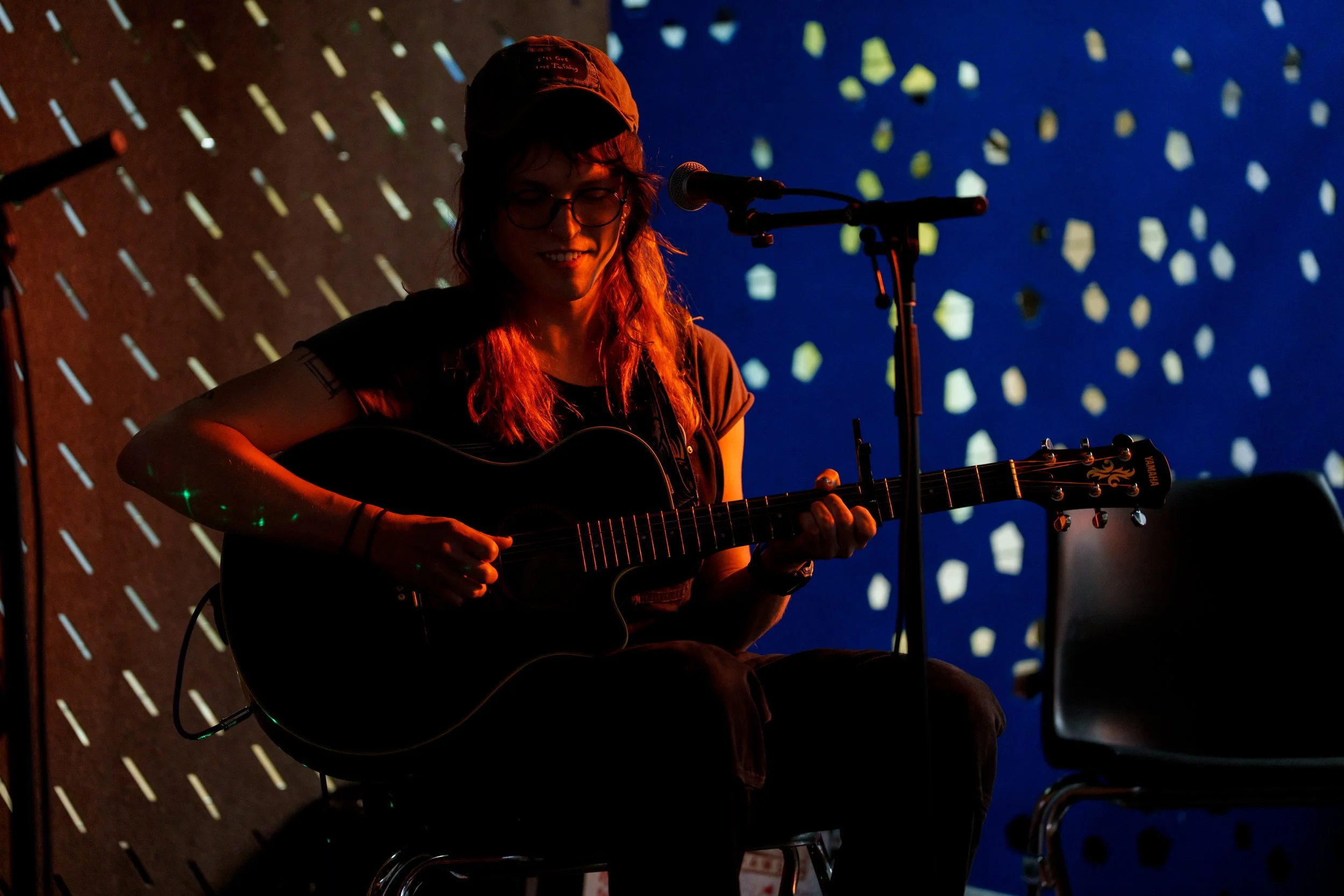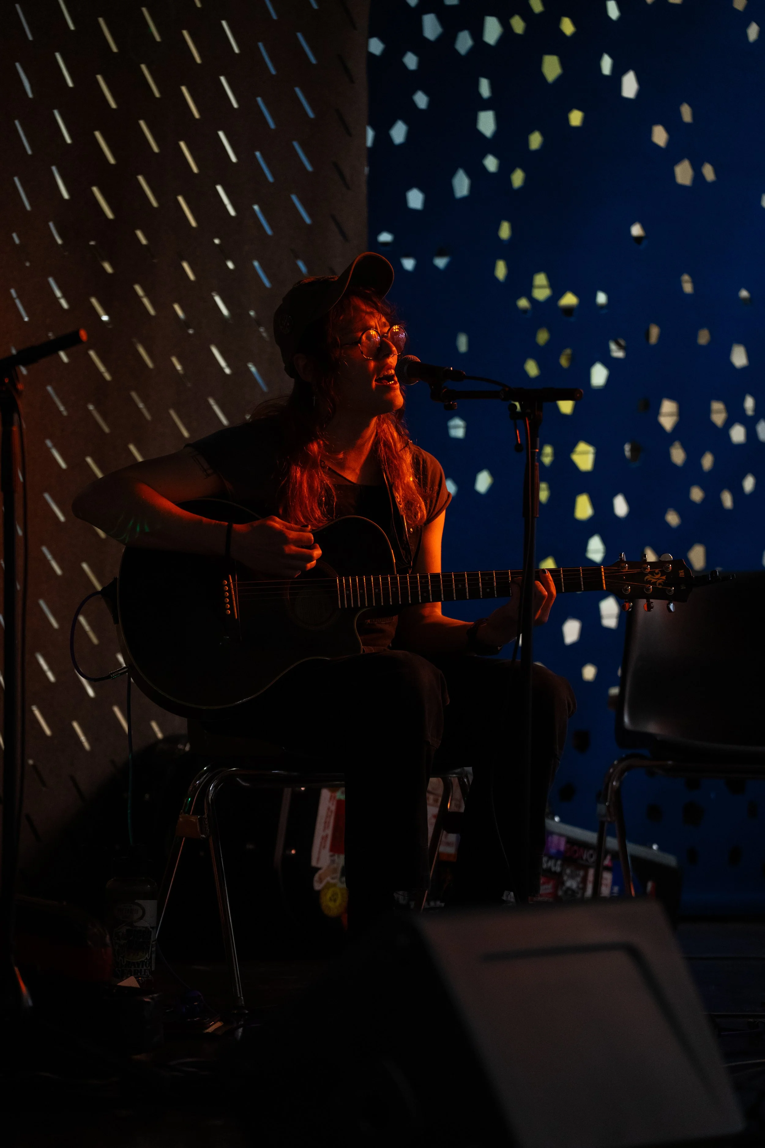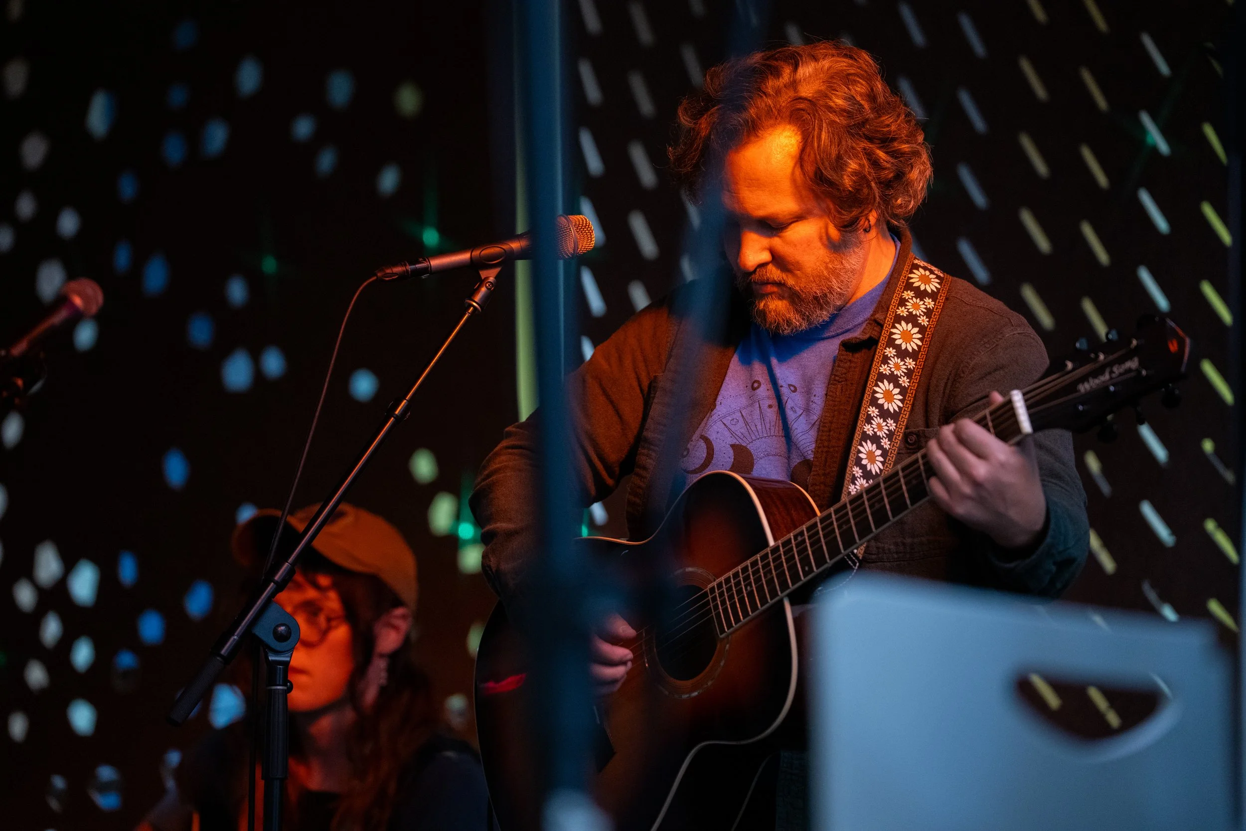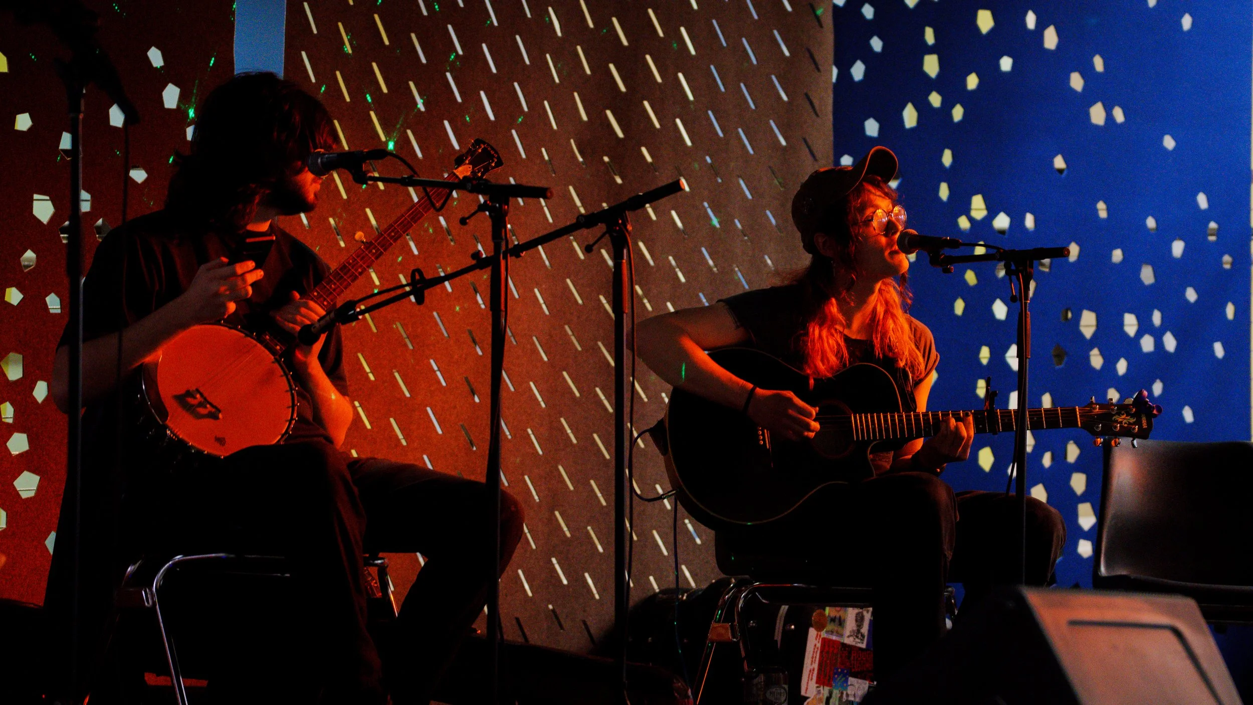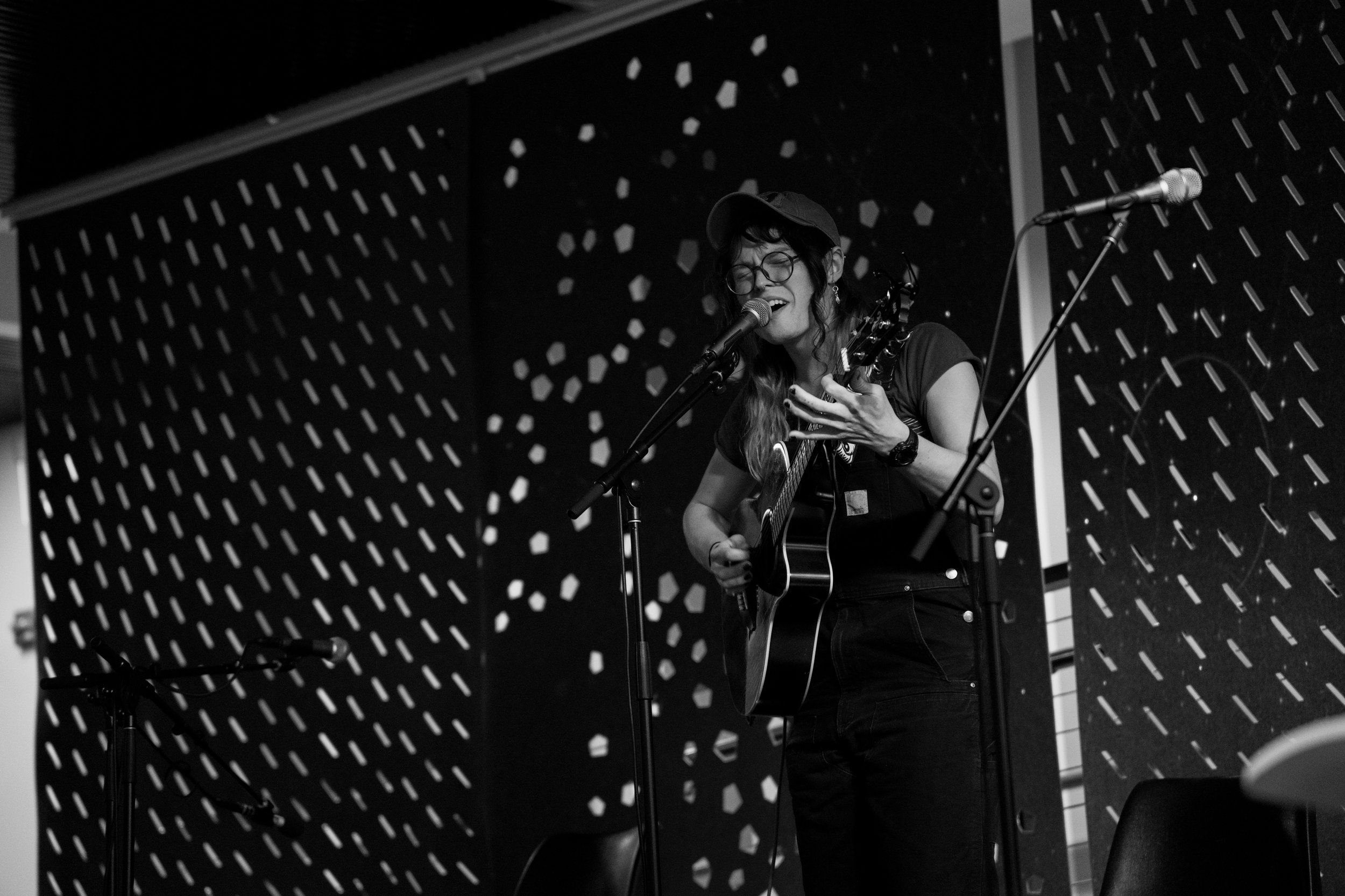 A songwriters' round sponsored by the Earlham Collage Music Department, hosted November of 2025 featuring Anna p.s. , Elijah Baston, and Cyrus Garretson.
