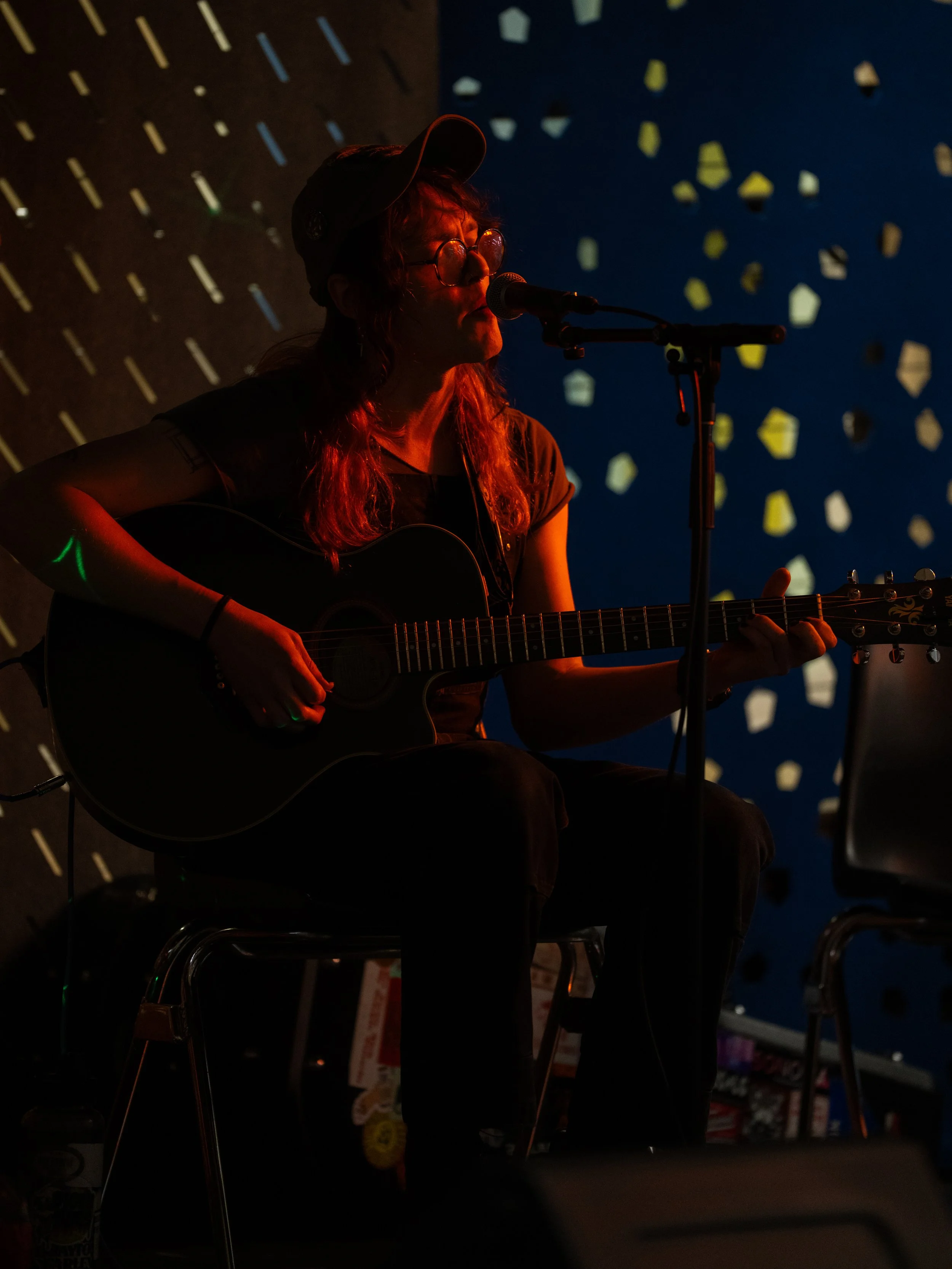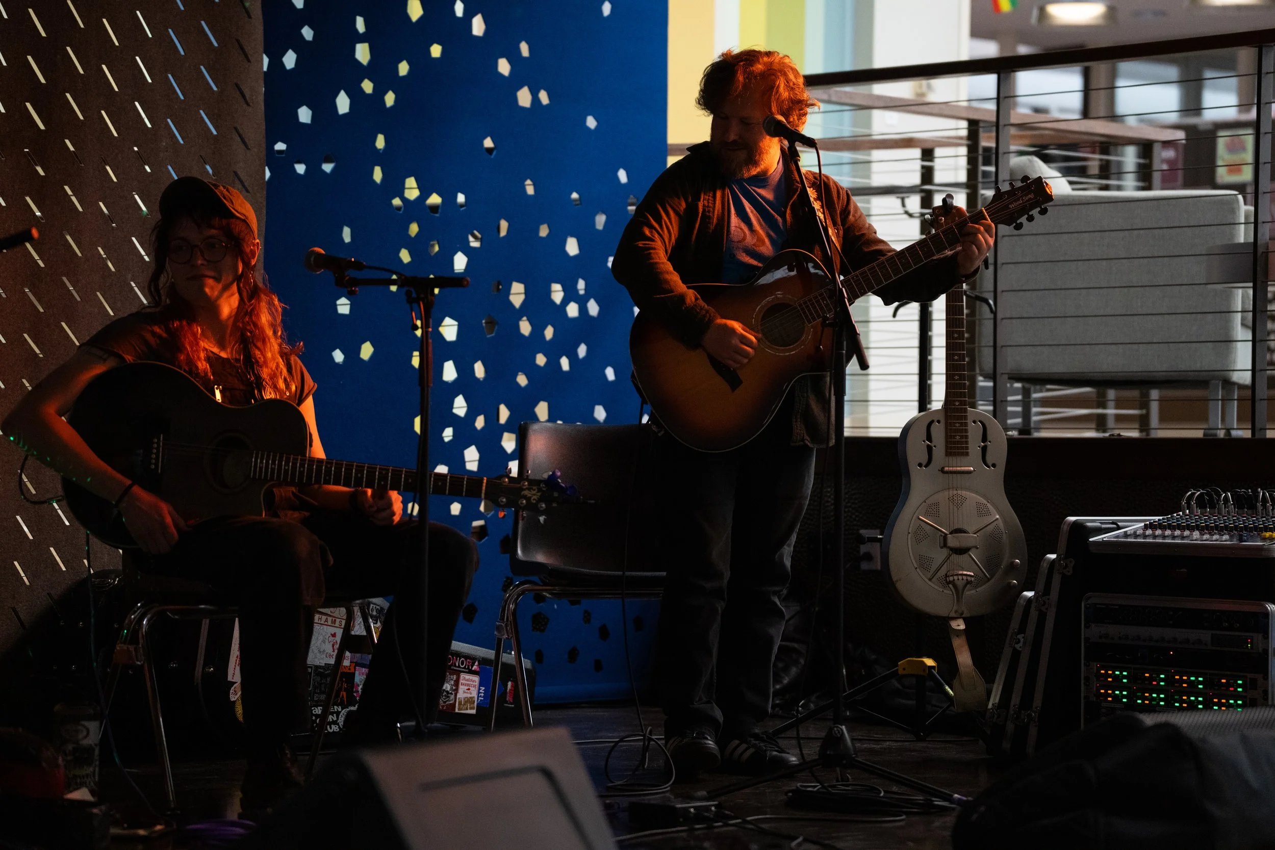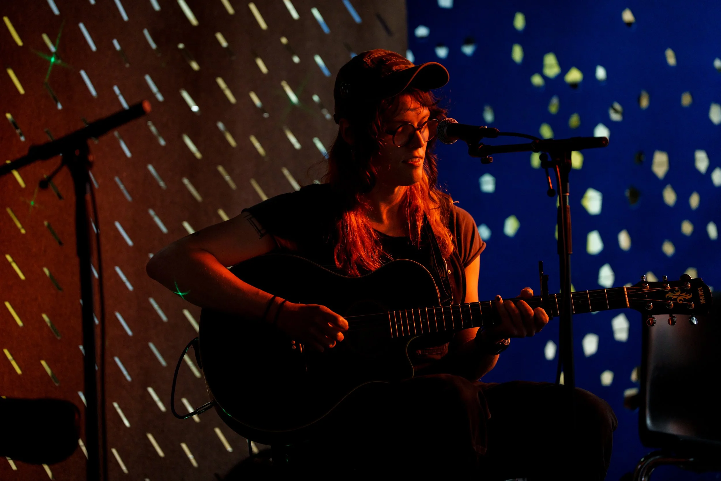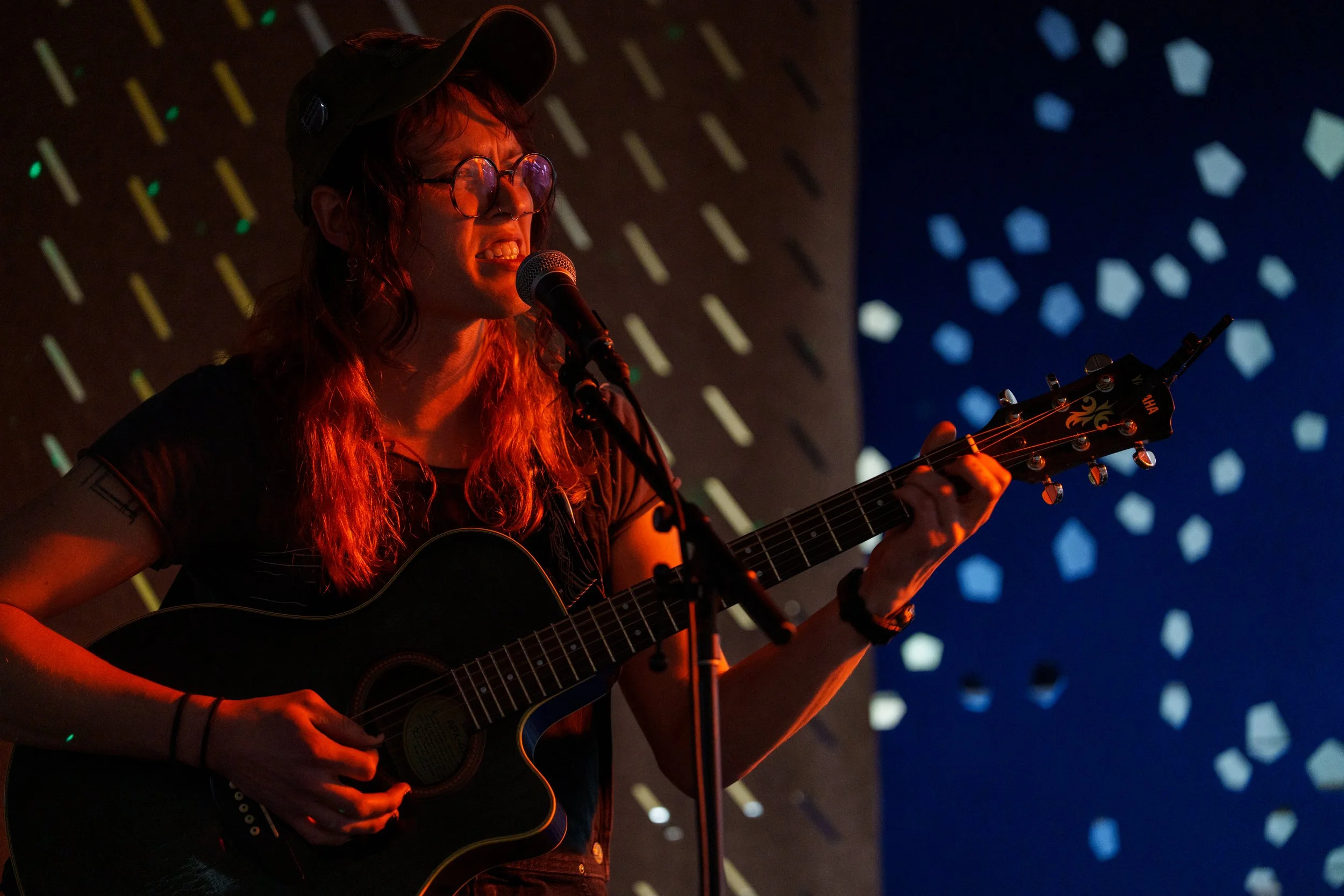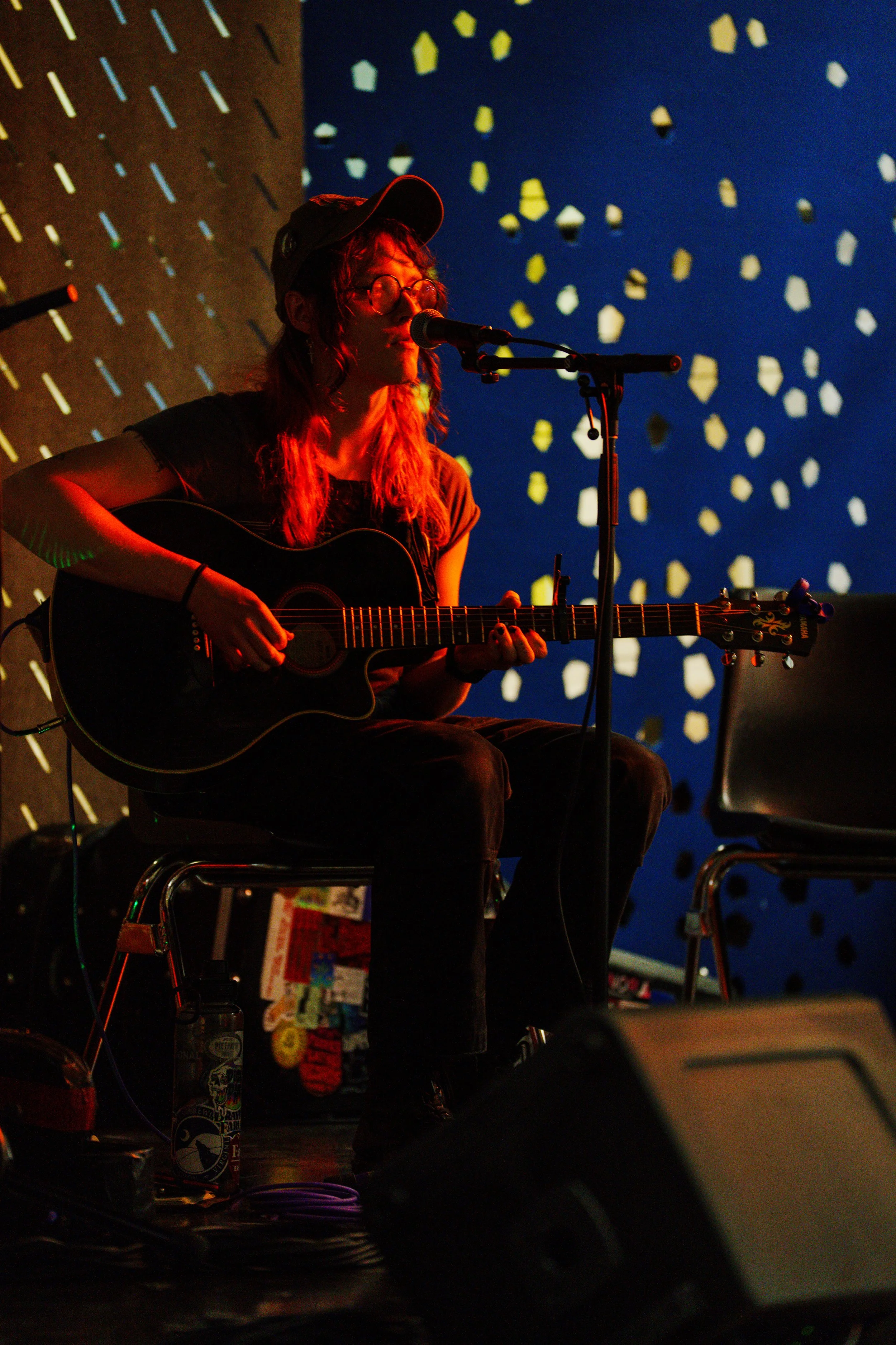 A songwriters' round sponsored by the Earlham Collage Music Department, hosted November of 2025 featuring Anna p.s. , Elijah Baston, and Cyrus Garretson.